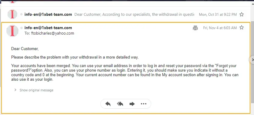 My account number is [protected]. I made a deposit using bitcoin dated 25-10-2022 at 1.14pm. It was a deposit of 0.005197 which was equavalent to $100usd. I sent it from wallet id 3BhqSZhToLeT5UMPT9yeWEzcjSvEx9Ko5b and i sent it to wallet id 32a9597jHCMASMRnsrrXwXG7MKcSE7XeCg which was provided by the app. After 24 hours i sent an email to [protected]@1xbet-team.com and I got a response after a week and some days and they said that they had credit money to my gaming account but there is nothing in my account. They dont respond to queries and when they do it is so not helpful and you have to wait for the next response that will come after weeks.