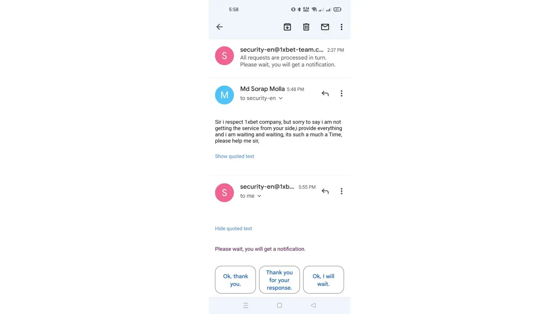 Ask documents. After received my documents now security team don’t reply me.