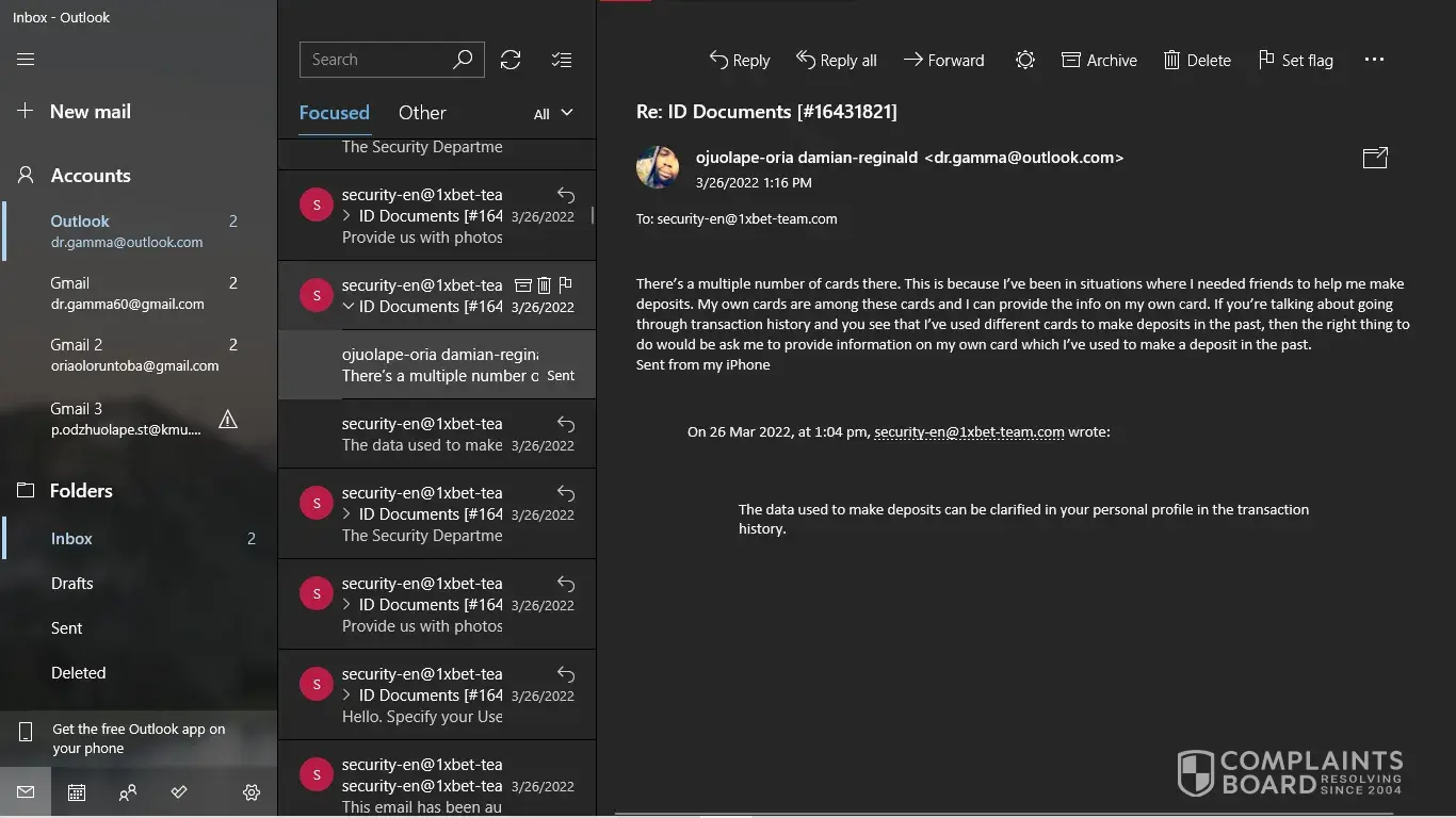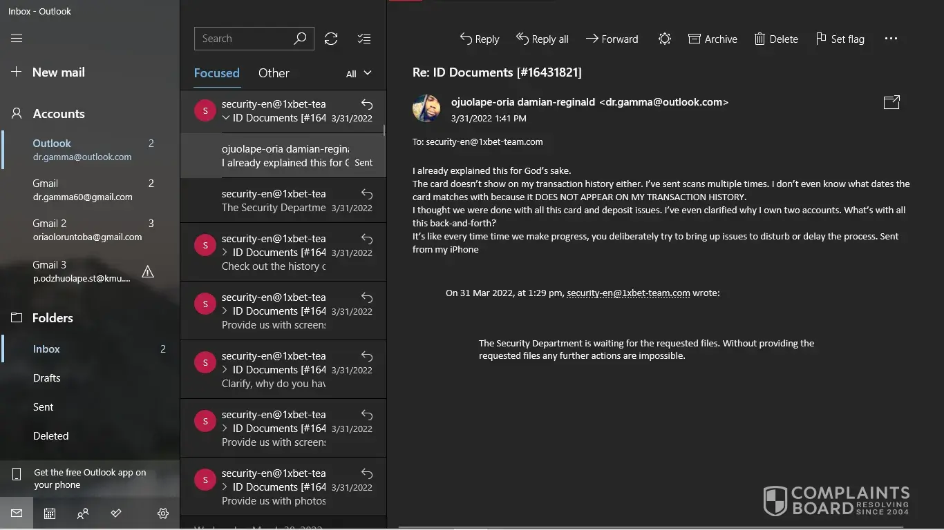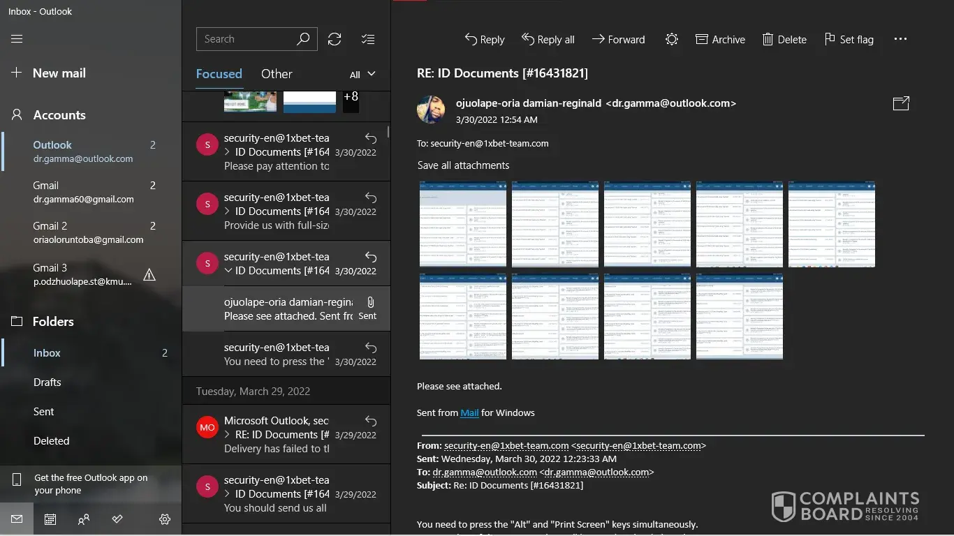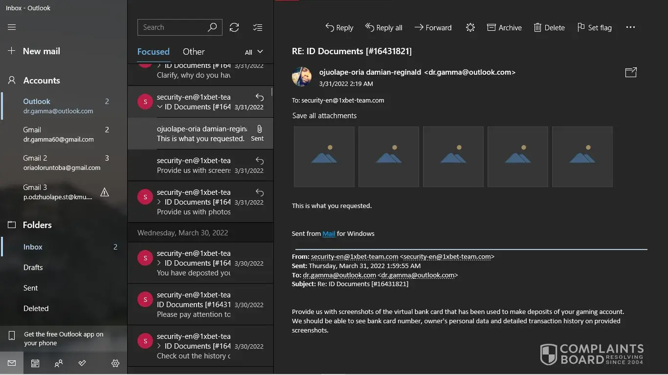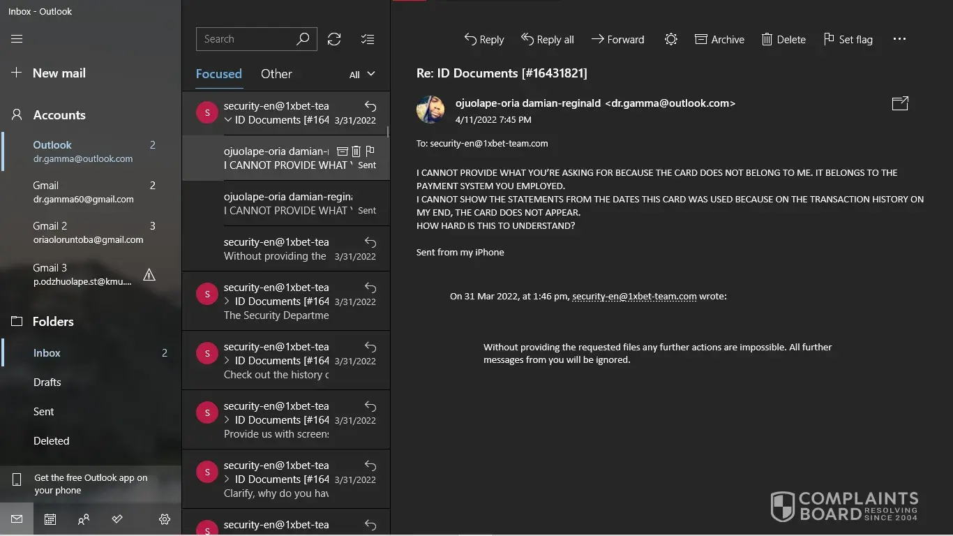 I have my NID card, My last deposit screenshot. But [protected]@1xbet-team.com don't response my mail after see my account id.