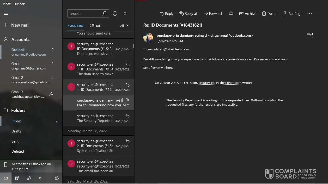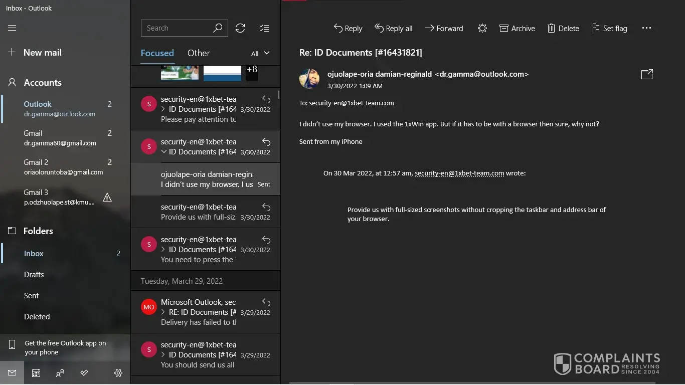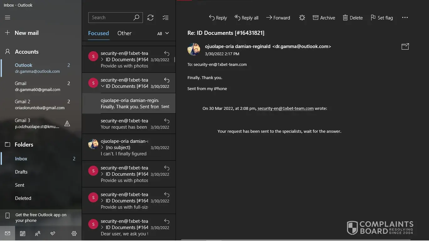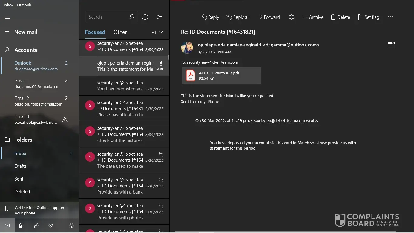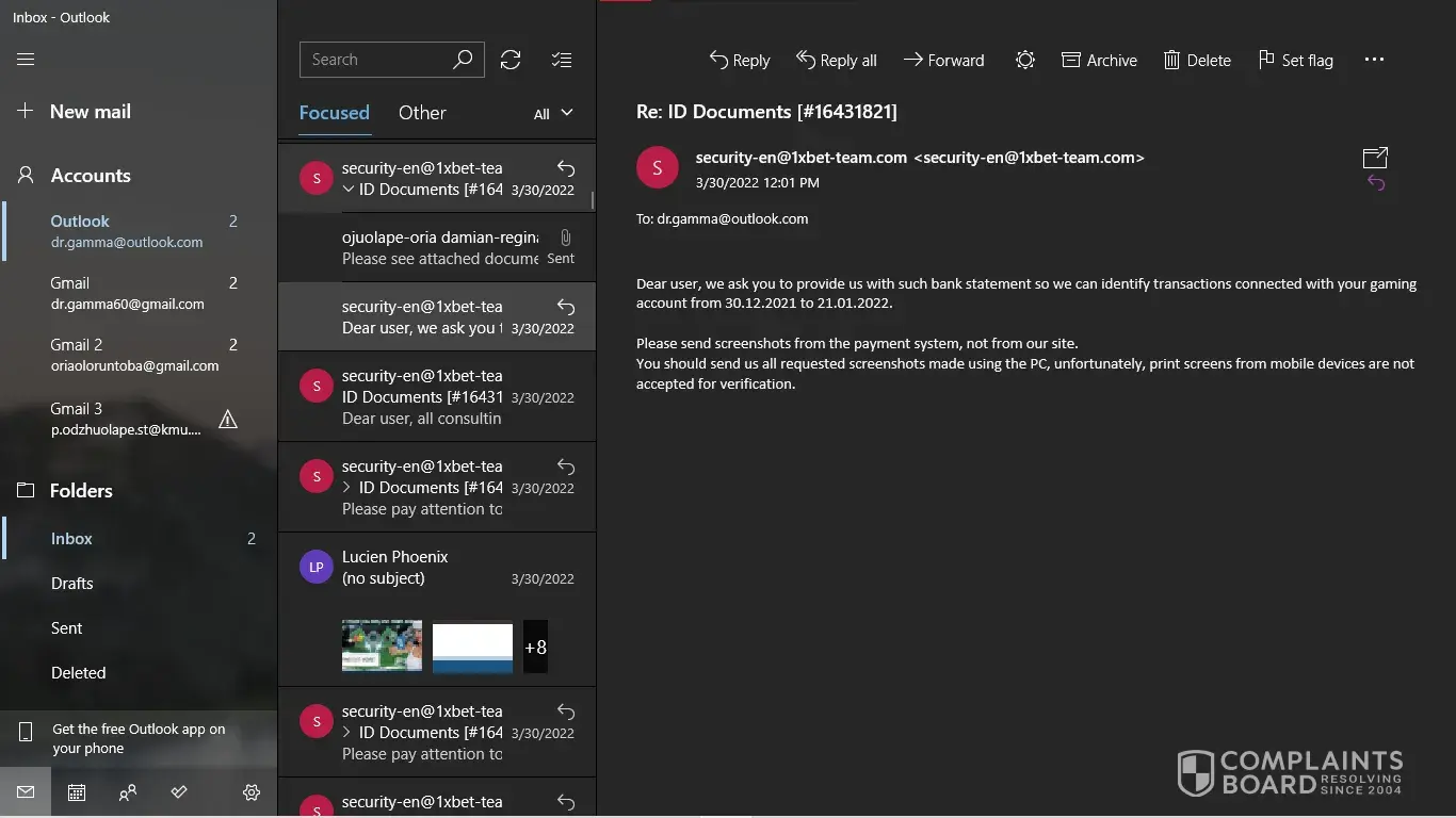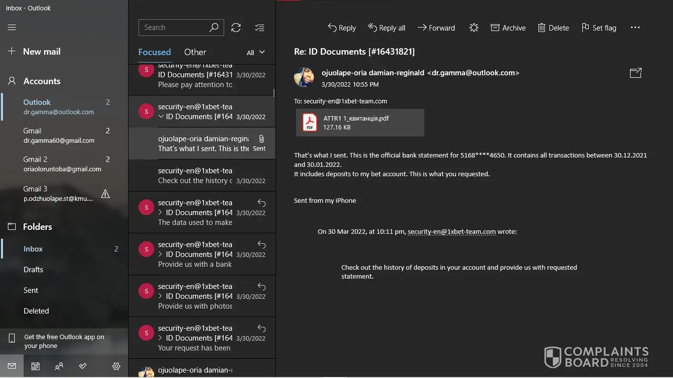 I have my NID card, My last deposit screenshot. But [protected]@1xbet-team.com don't response my mail after see my account id.
