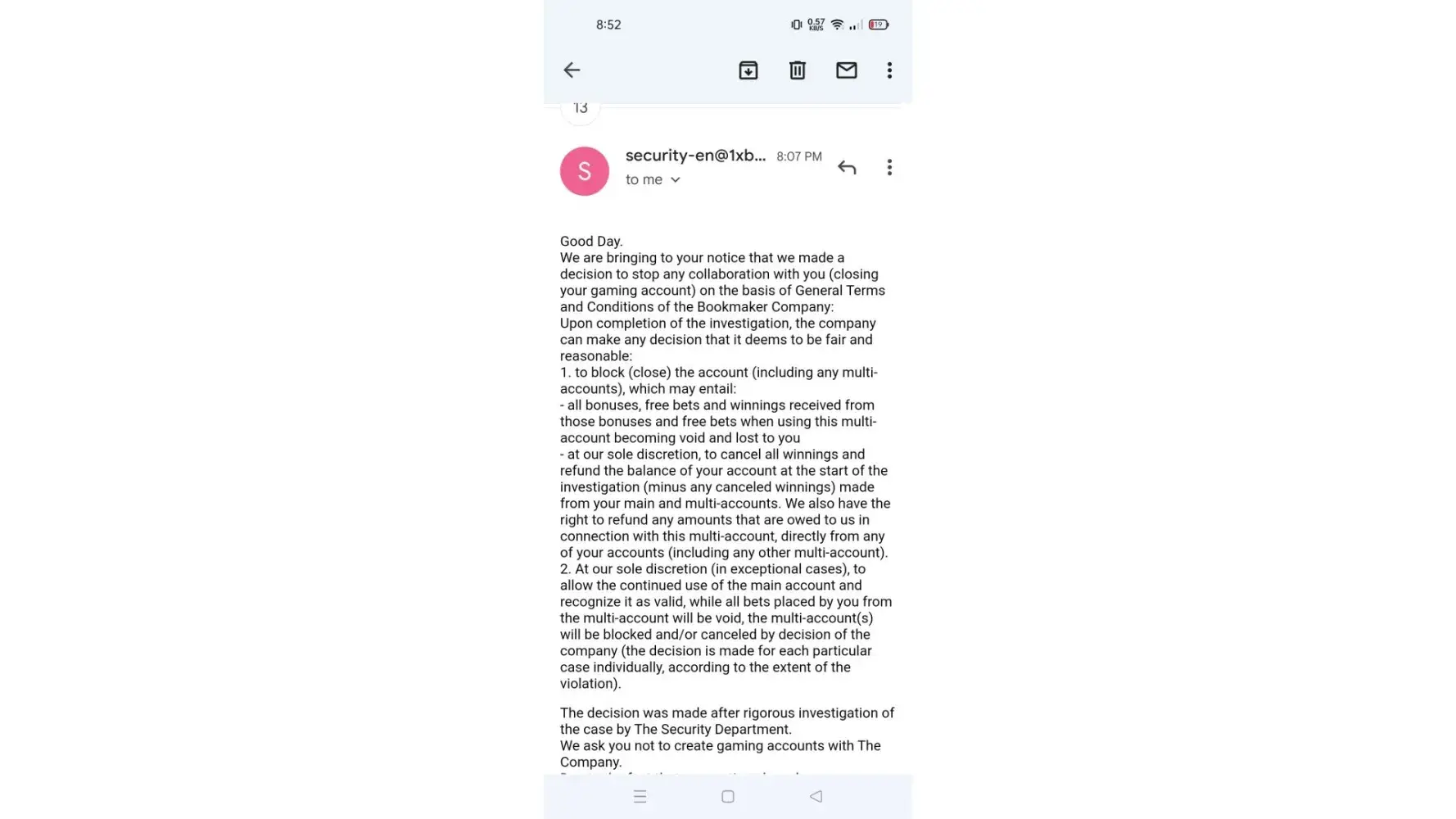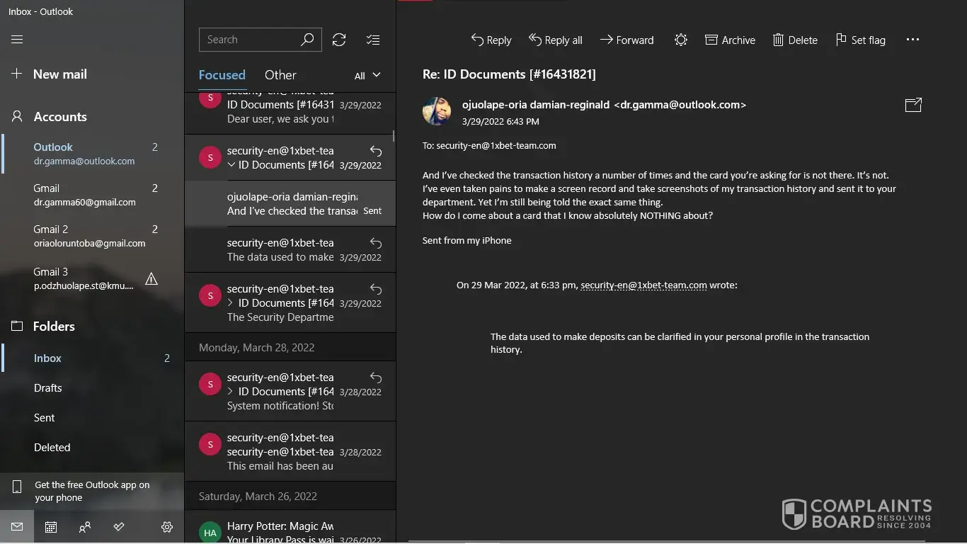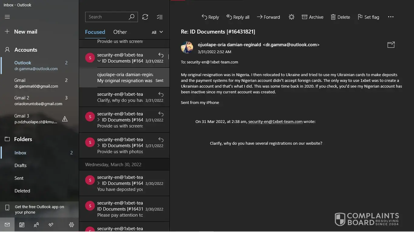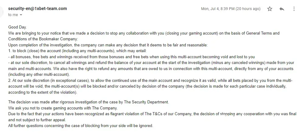 1xbet confiscated my winning stake. They said I used multiple accounts but I don't have multiple accounts. There is only one account. I am complaining that my money is being taken without any real basis.