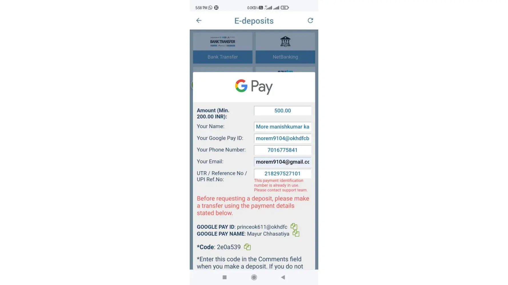 Today I am depositing 700 rs via Google pay to 1xbet team but while deposit to my 1xbet account i mistakenly type 200 rs and now only 200 rs deposited in my account but rest is pending due to typing mistake please do the needful because I am trying to deposit rest amount it shows This payment identification number is already in use. Please contact support team.