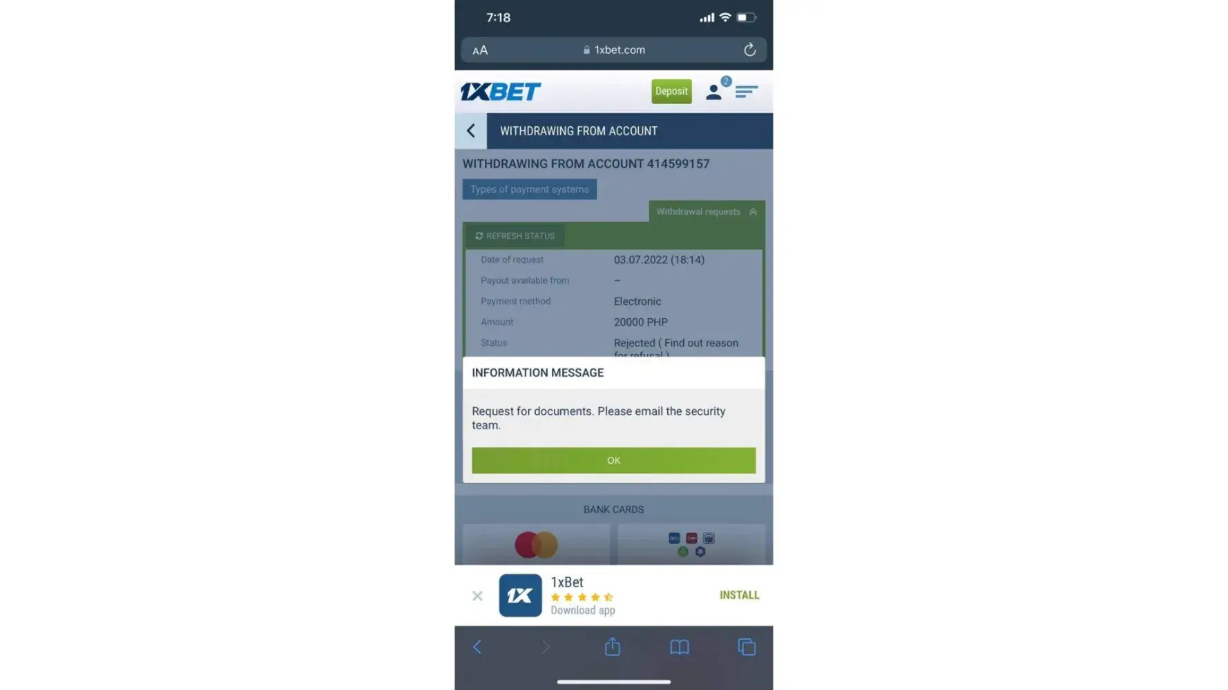 I am a user of 1xbet my id is [protected].I won some money by playing games.but every time my with is being rejected.plz solve this issue.