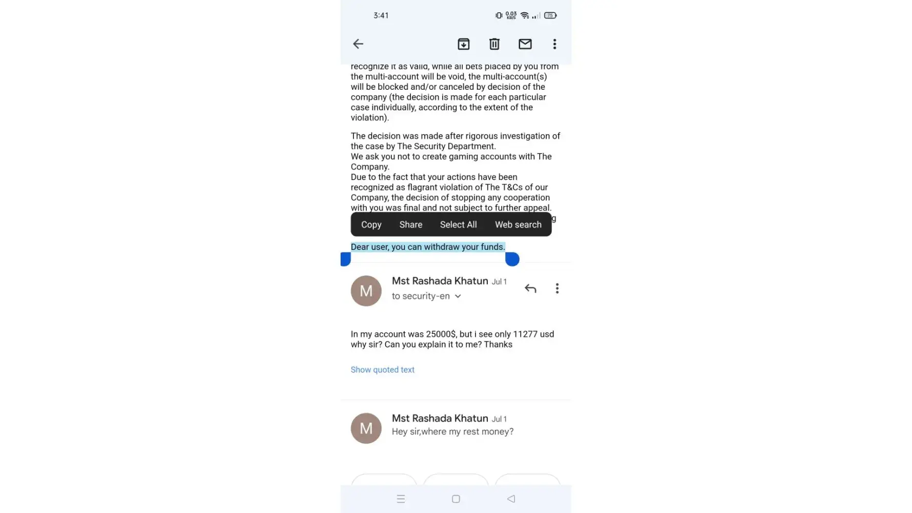 I create My account and then i start play,after that i win some money,its About 25000$ totall,they ask documents and i provide the id card,holding nid then,they ask some security question i answer them all,but after they they reduce my winning,i mean they void my all Win why?if.they can't pay then why they still run this company?hey Should pay me,thanksi am waiting for my rest winning Money,