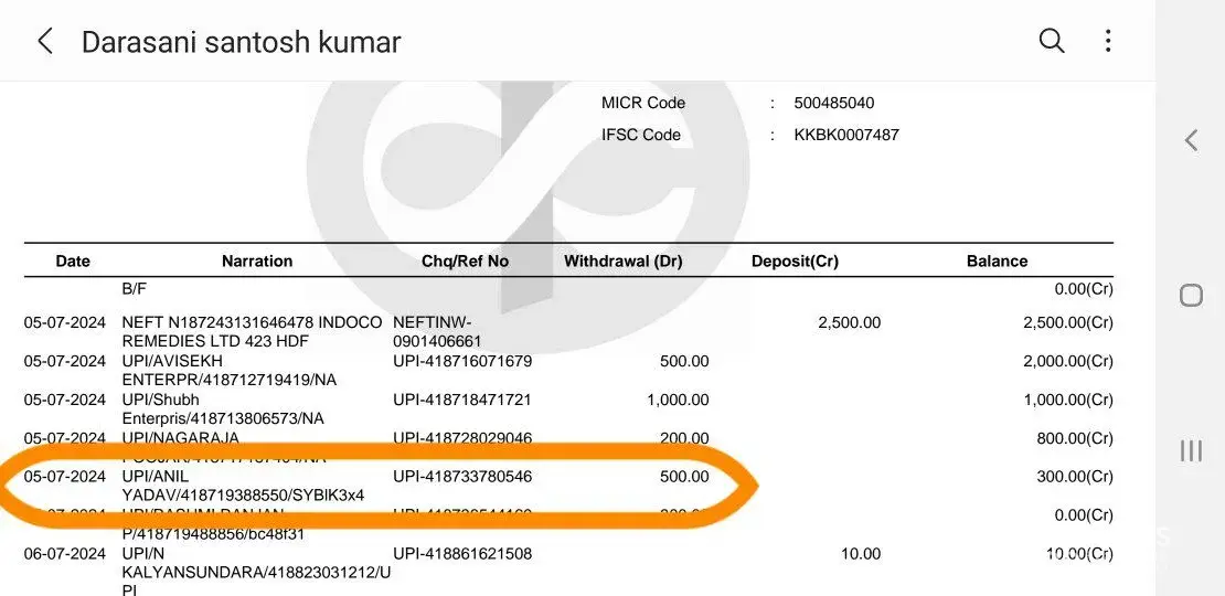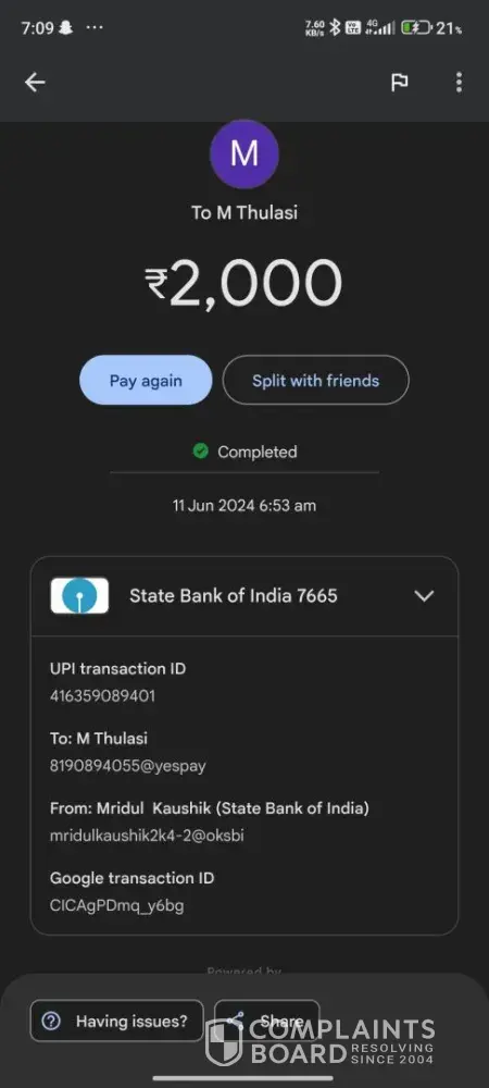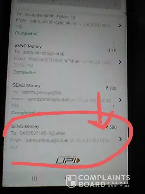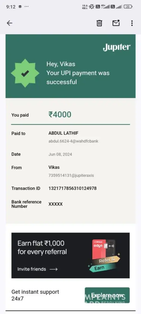 6. Dated 11th July, 2024, there was a UPI transaction of 20,000/- done to Mr. Dhanush & it showed success but funds are yet to be reflected.