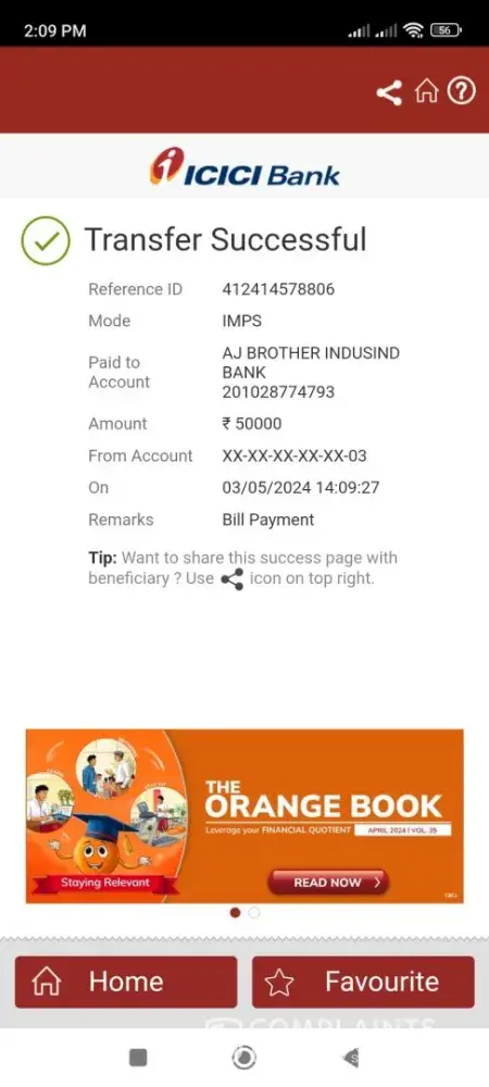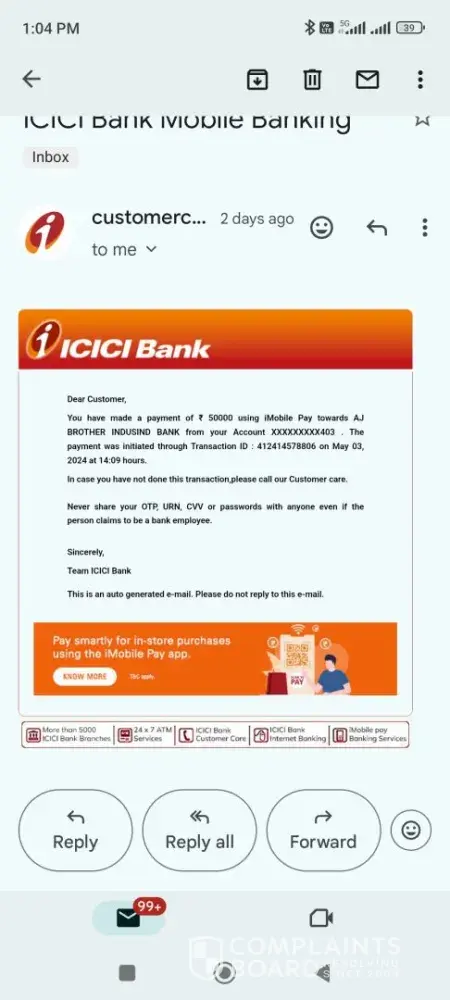 I did a payment of INR 50000 on 03.05.2024 but after some time I got a notification saying Deposit rejected in the amount of INR 50000 via epayment (Rejected) I tried to connect customer care by using the online chat and calling facilities, but every time when I call them ended up with giving fake promises saying that the problem will resolve within one...