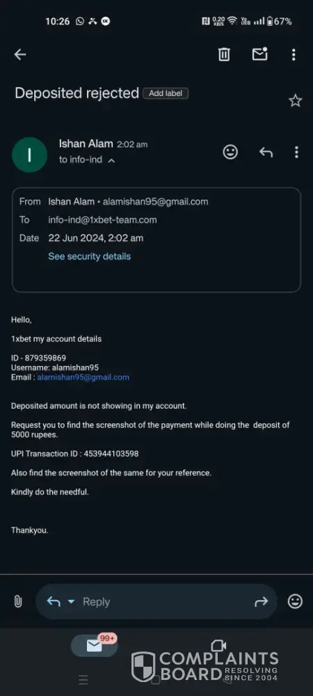 I deposited 5000 inr, in my 1xbet account on 21st june 2024 but no amount was credited to my account. I checked with the 1xbet support team by submitting all relevant documents but till today no reply from the team.
