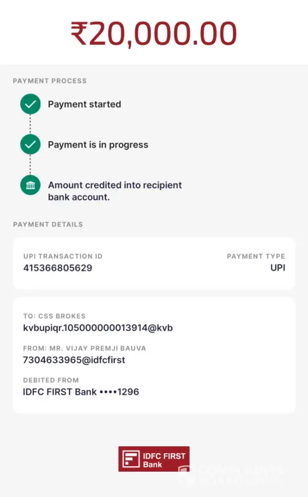 4. Dated 1st June, 2024, there was a UPI transaction done to CSS Brokes of 20,000/- which was done successfully but it never reflected my account. It was told to me on email support of 1x bet to create a payment slip through Paytm UPI with UTR and I did that twice, still no amount came in.