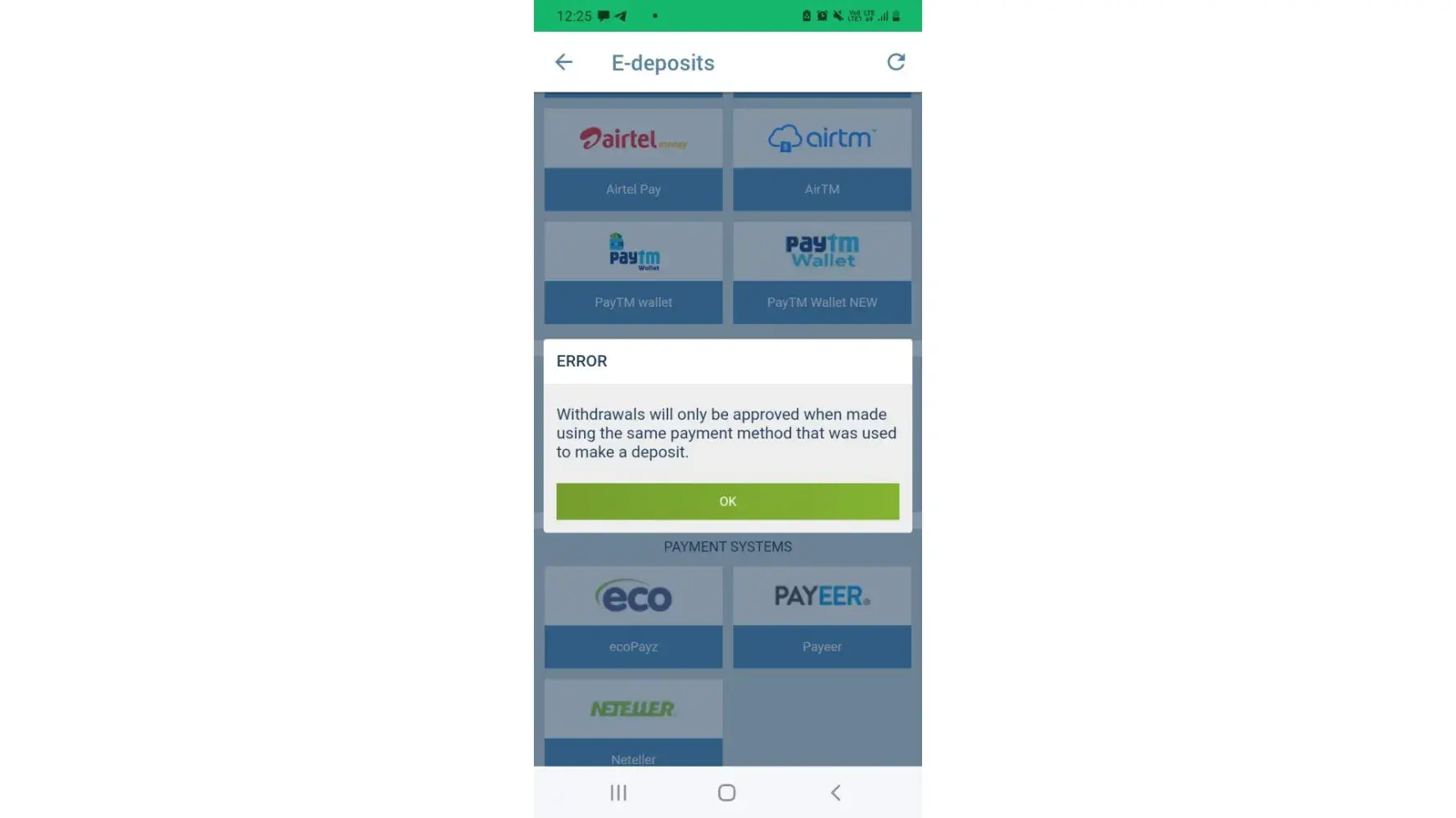 But again i deposit money and play few winnig amount i want to withdraw but operator decline because the reason is same payment method are not available how much time is taken to resolve this issue thanku
