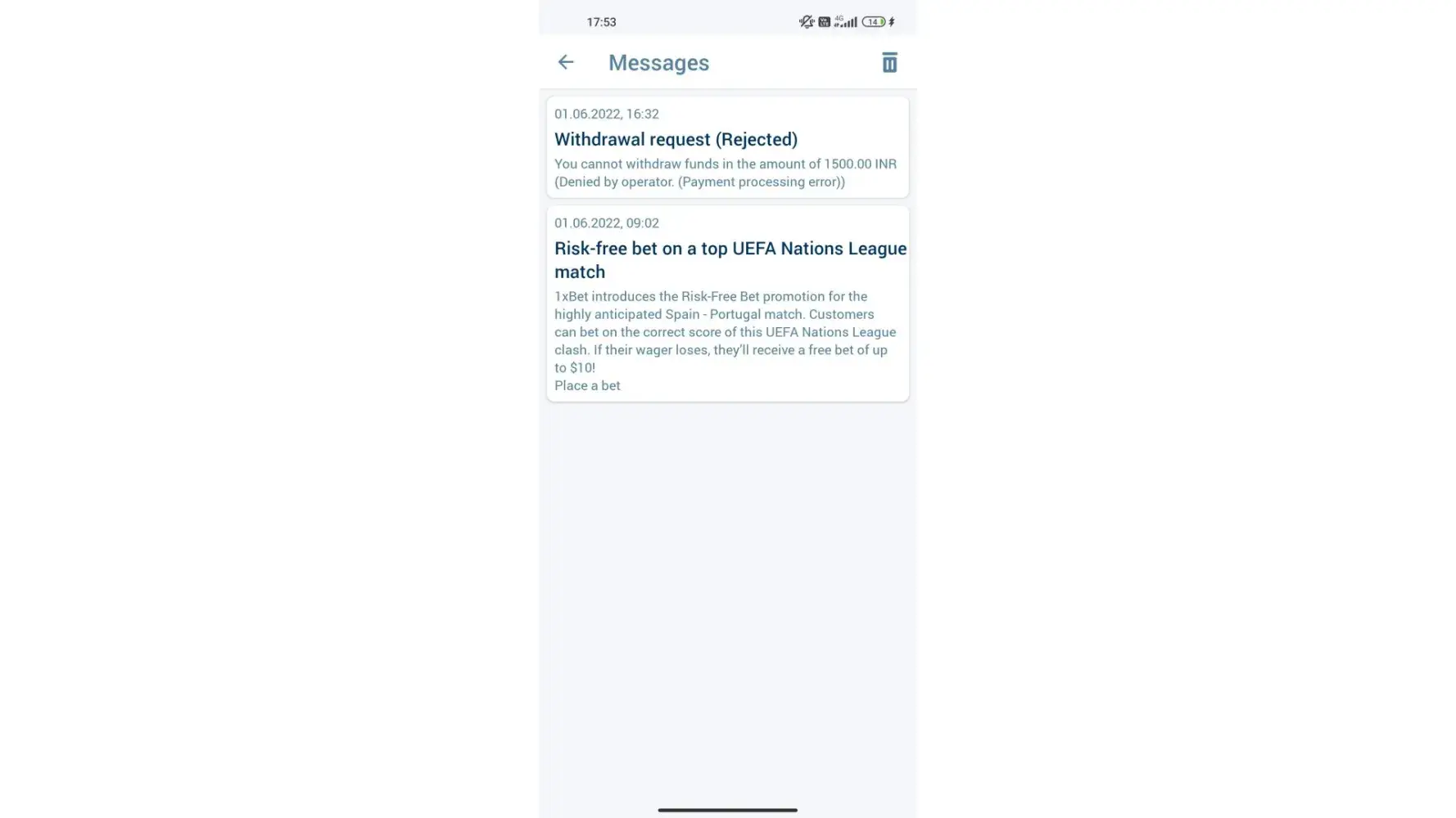 Such a huge problem in 1x for withdrawl, req placed on 20-05-22 thru paytmwallet new till now did not receive the amount when I chat with customer care they block my chat stating coz of ipl ot will take 7 days which is a non sense, request to be done in 24hrs as per the rule