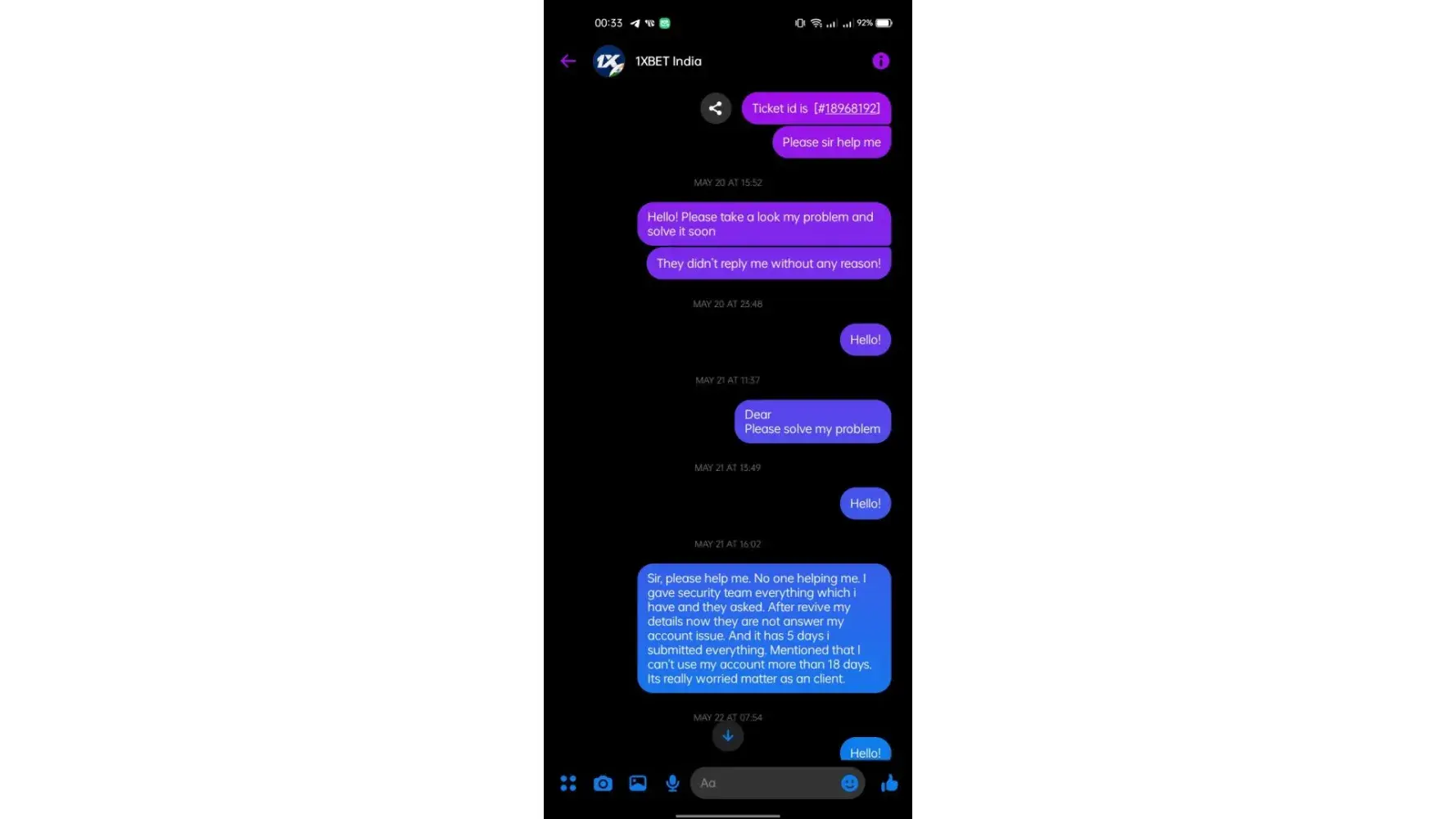 I have been betting with 1X Bet for the past 5 years and never faced any issue until a month back when I received notification to send documents to Securities Team for account verification. I forwarded them my PAN card and Aadhar card details which took several weeks to get verified. Now your securities Team has asked me to provide details of all the deposits i made to my betting account in these years.In the last few years I have deposited several lakhs rupees to my betting account using Gpay,Freecharge,Paytm which are all linked to my Savings account with HDFC. I can provide HDFC bank statement to you but providing details of each deposit made to betting account is almost impossible as i have deposited various amounts to my betting account on more than several hundred occasions. How can i provide individual details of those several hundred transactions. To be honest I have not been asked by any company to provide these kind of details.It is pretty clear that you are just delaying things with these stupid questions and have no intention to return money.You yourself must be having details of each deposit I made.Asking those details from me does not make any sense.Unfortunately I do not have any option but to lodge FIR against your company and celebrities who endorse your company. Had i known that you will ask for these wierd details i would have never betted through your website.I was not aware that you can be so bad towards your loyal customer like me.Asking these questions make me believe that you have no intention to return money.