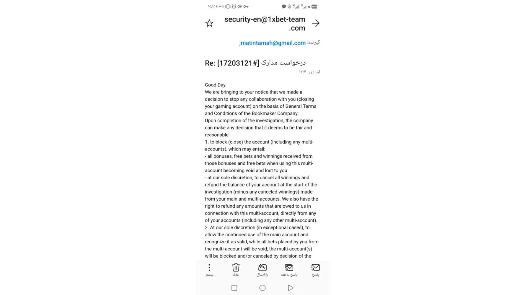 I am a football fan. I recently became acquainted with different types of sports betting an interested to do that. I researched from friends and acquaintances about a good and reliable site with which I can deposit and withdraw from Iran easily. finally I selected 1xbet.com. and I deposited all of my annual savings. and then, after some bets and mix bets, my account was blocked and asked me for Id card and documents. after I sent them, I received a message: "Your account is under verification. Please, login to your account via PC in order to see the instructions."