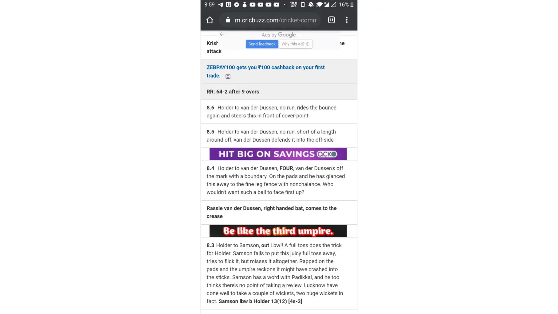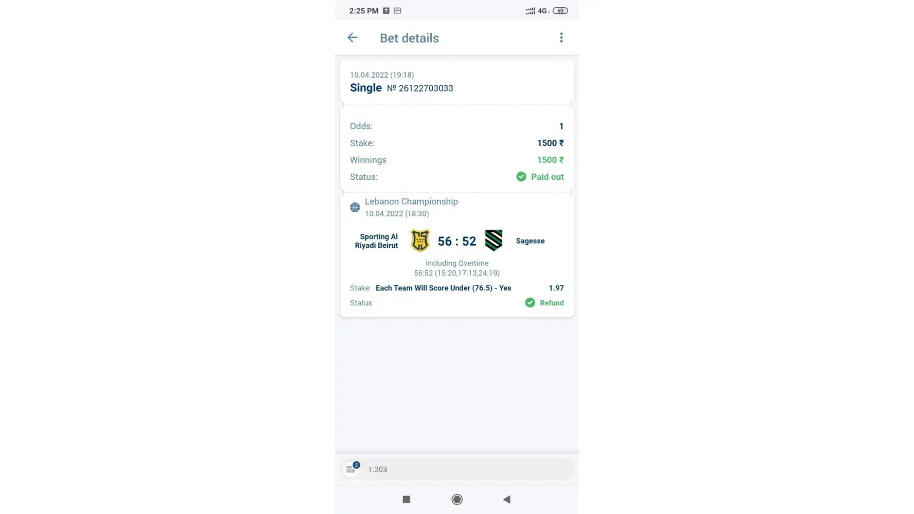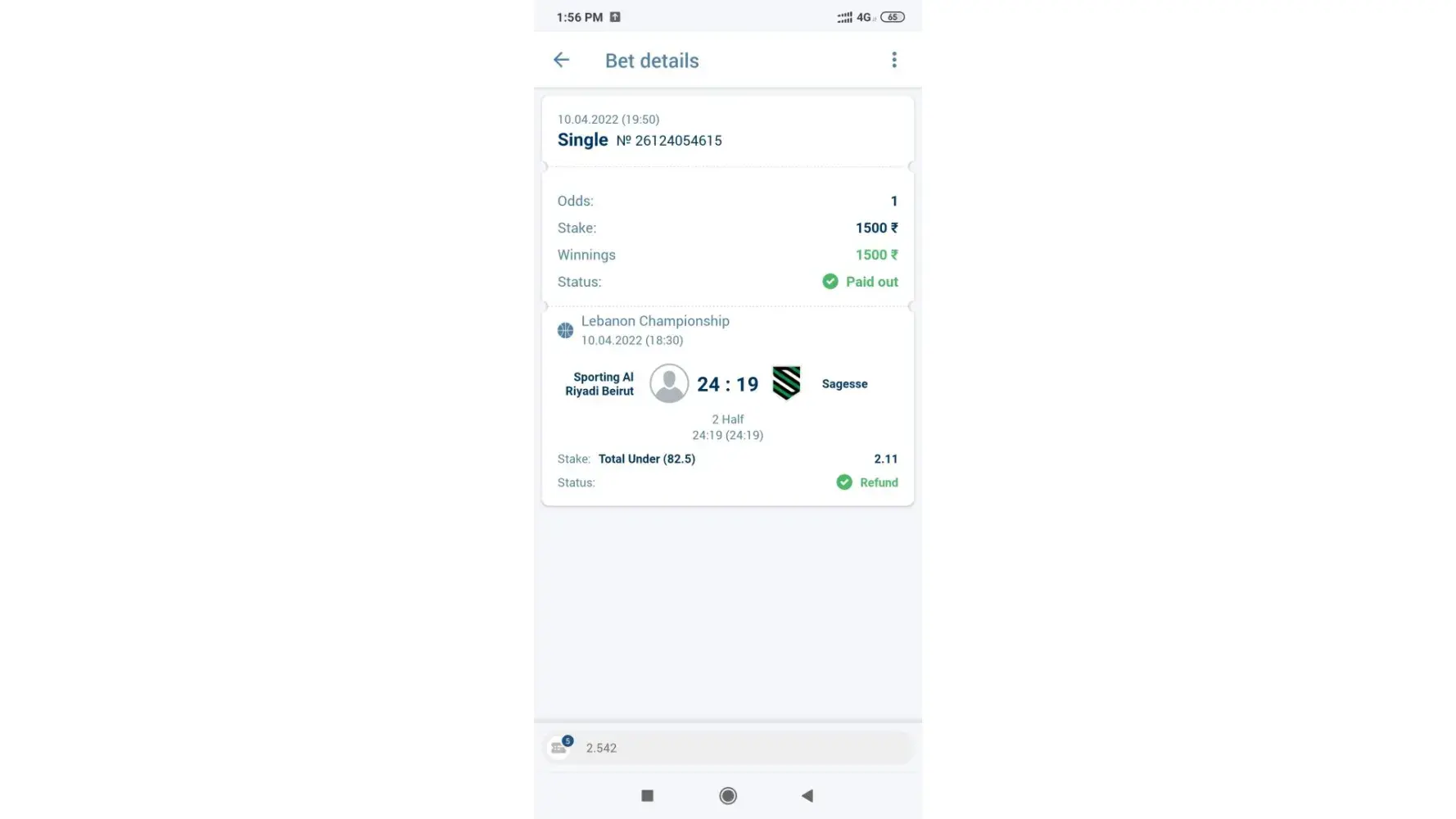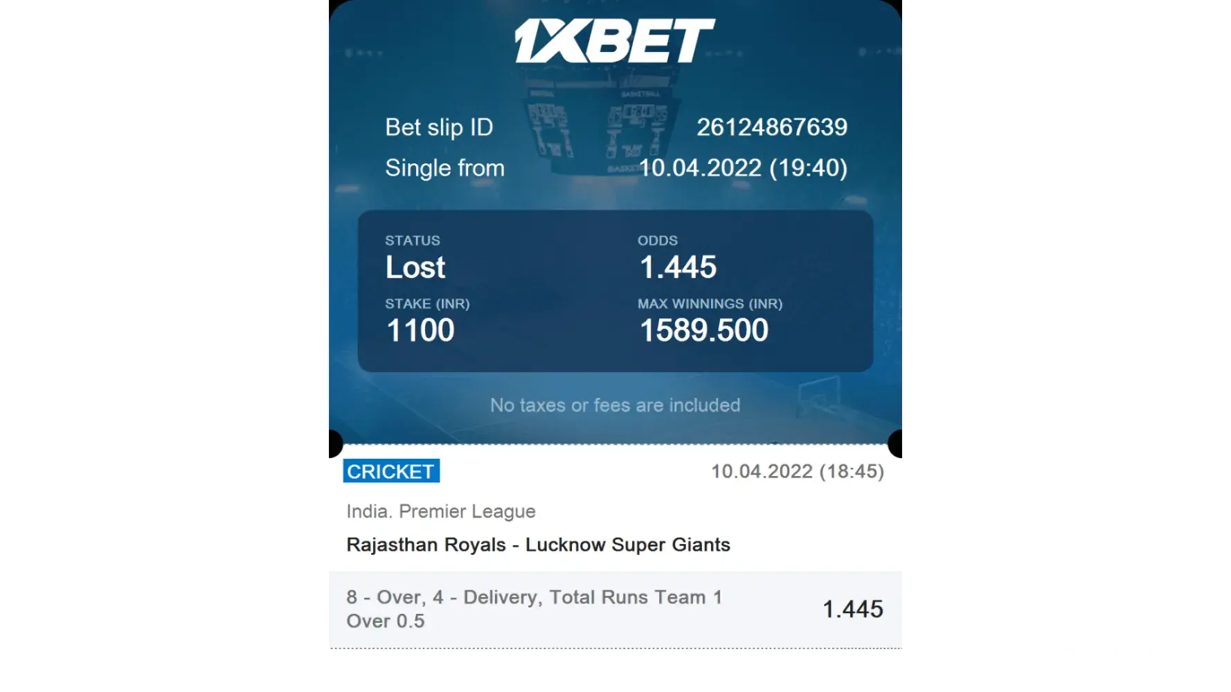 1) I bet on one match on europian t10 series on total score in 10 overs will be over 100.5, suddenly rain arrives, & match reduced to 5 overs only, my team scored 59/2 in 5 overs. They first refunded the amount, and declared me lost. Whether on other betting apps, used by my friends, they got a refund.