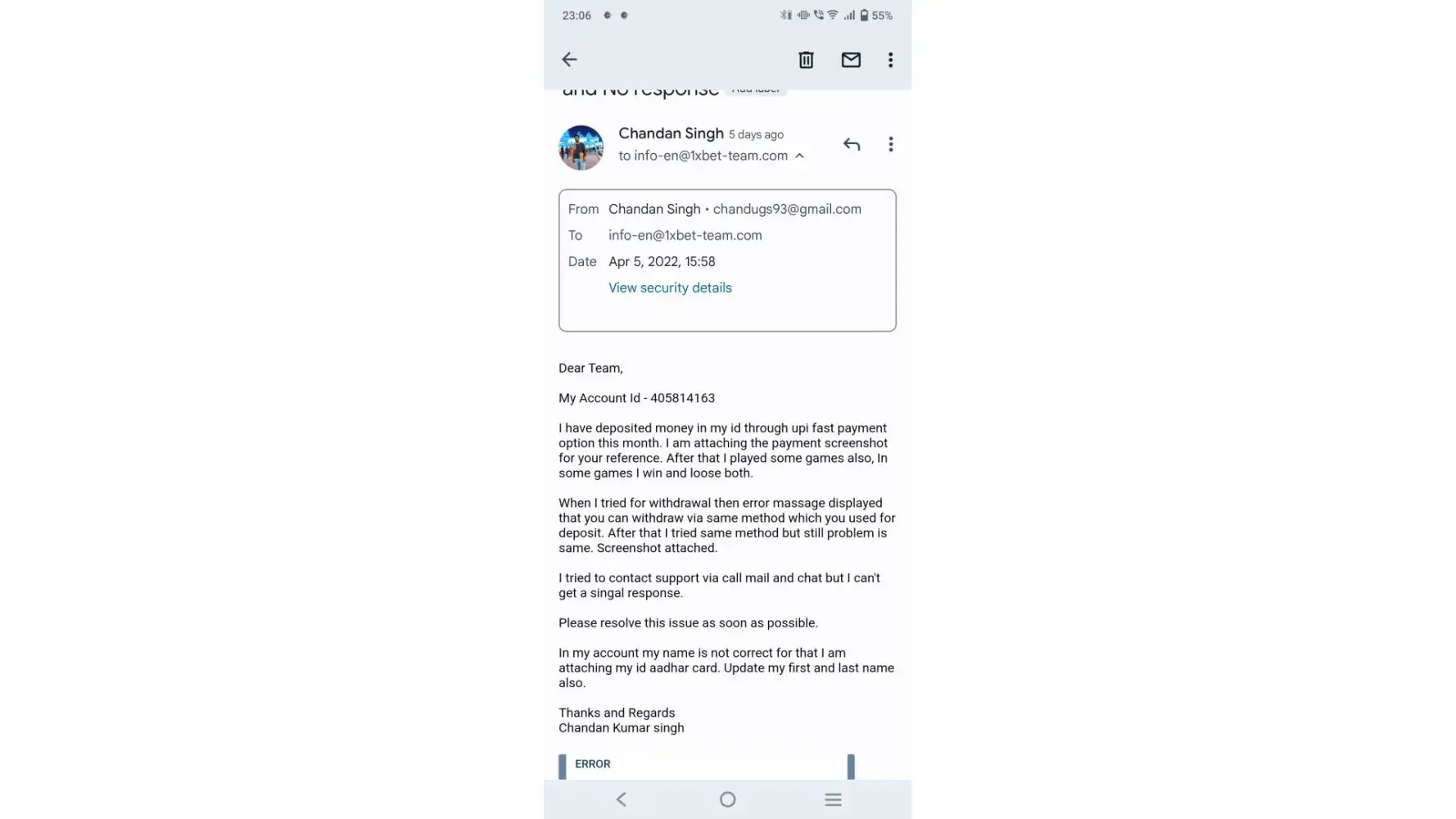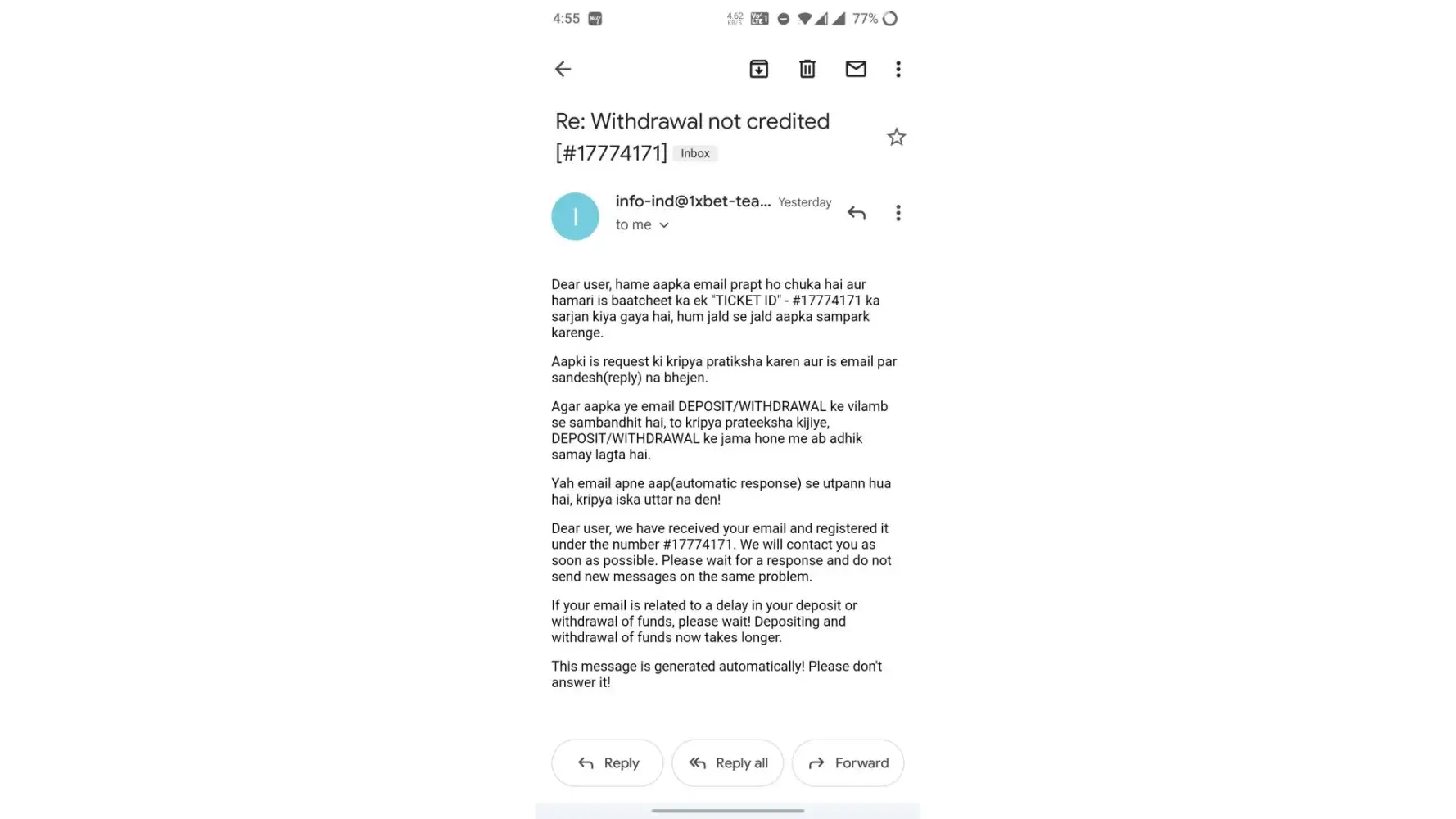 I have already contacted over email which is info-ind@1xbet-team.com and ticket no. Is [protected]
