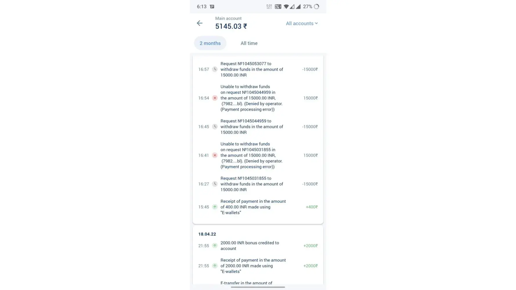 Hello team , this is to inform you that these mentioned below withdrawal requests wasnt credited to my account and some of them got rejected by operator i dont know why and even that all money not credited to my bank account even not returned to my game id which is [protected]. Mentioning withdrawals request no. Below along with my pdf passbook statement of my bank . 1. Withdrawal request no. [protected] of amount 3500 got rejected its was created on 8 april. Money still stuck not come in game id nor in bank 2. Withdrawal request no. [protected] of amount 2800 rs got denied ( payment processing error) created on 13 april . Got denied yesterday after 7 days money got stuck . Not received in game id nor bank account. 3. Withdrawal request no.[protected] of amount 15000 rs not credited still under process request got approved but not credited. Kindly look into this. 4. Withdrawal request no. [protected] of amount 5000 rs not credited still pending but request got approved not credited to my bank . Kindly look into all these above query else . I have to file a legal suit against 1xbet as my money got stucked since last 10 days and every time ur consultant via chat told me to wait for more 7 day again 7 days which is very unprofessional. If i dont get these withdrawals in next 2 days then i will pursue the legal suit for scamming customer against 1xbet . Kindly look into it asap and revert positively if i didnt receive any revert within 24 hr. I will file case. Attaching screenshots and pdf of bank statement kindly check