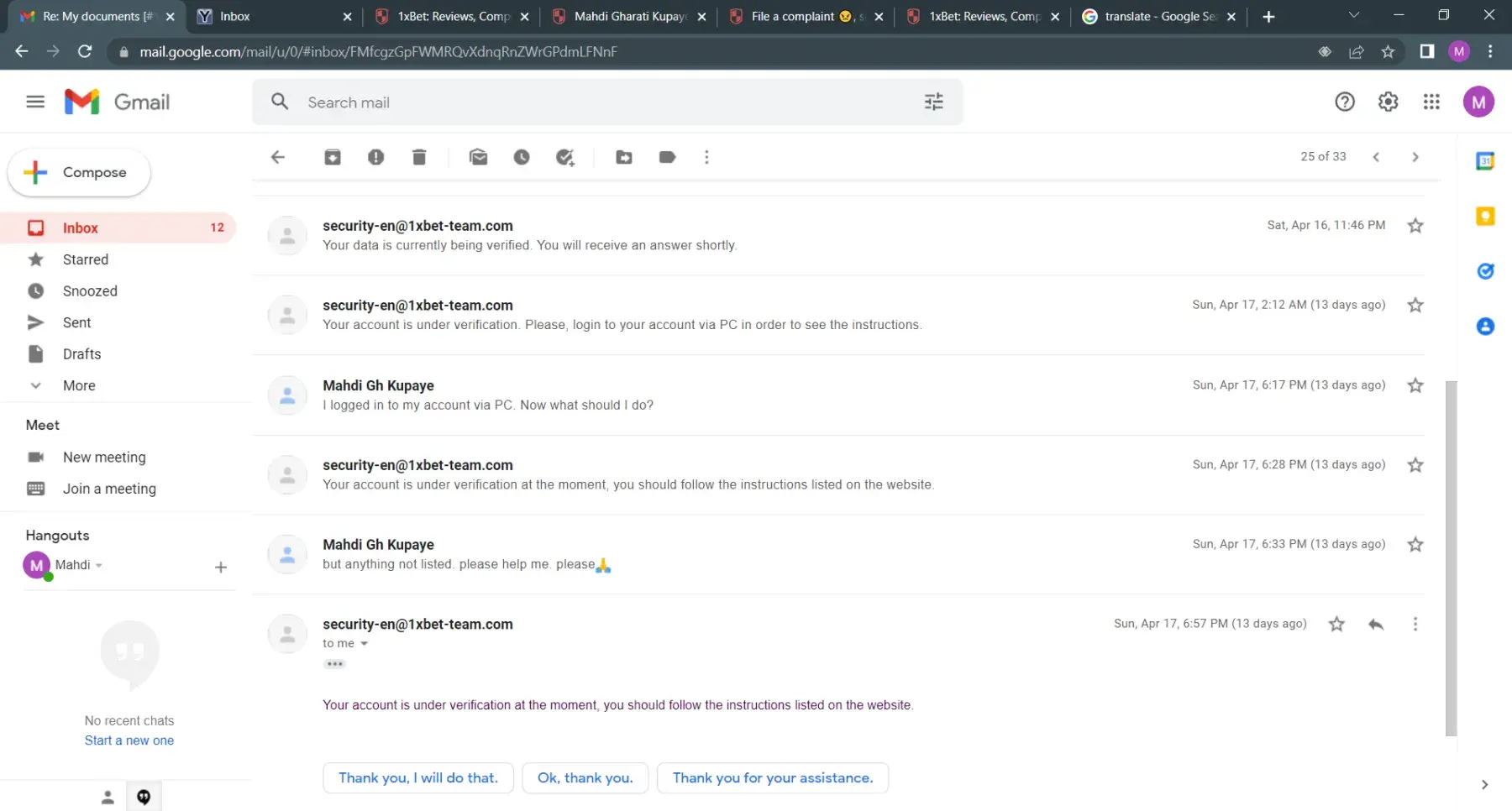 then when I logged in with PC, just see this window (attached photo). and after 72 hours I did not received another answer. and also when I send every another email to security team always I will receive this same message: