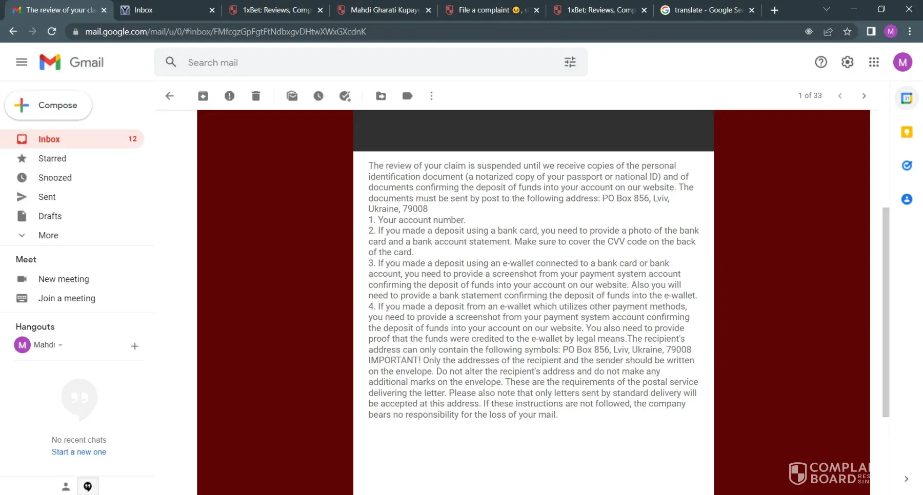 "The review of your claim is suspended until we receive copies of the personal identification document (a notarized copy of your passport or national ID) and of documents confirming the deposit of funds into your account on our website. The documents must be sent by post to the following address: PO Box 856, Lviv, Ukraine, 79008"