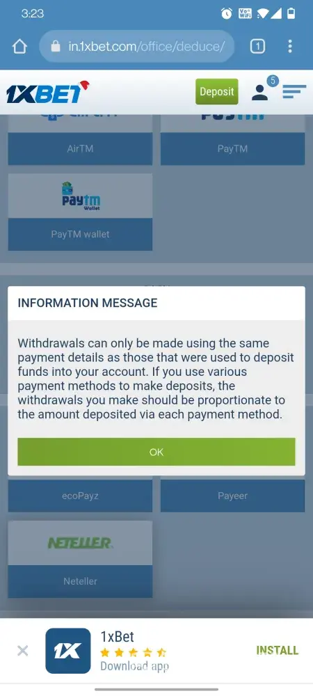 I deposited money through UPI mode and now even i cannot withdraw because I am am getting error while withdrawing to use Neteller as withdraw mode. I have used multiple modes for deposits now but during withdrawal they it gives attached error message and ask me to withdraw through Neteller app only but in reality they have blocked withdrawal through Neteller.