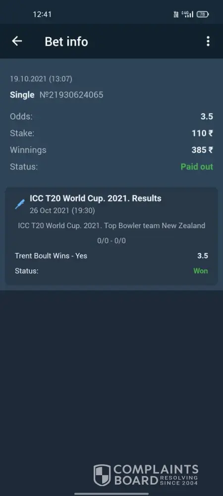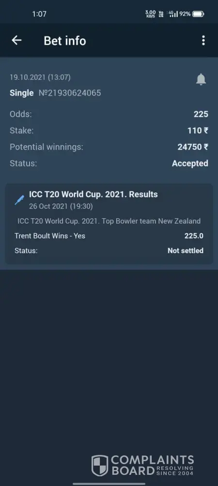 I had placed a bet in 1x bet at odds of 225 after winning the bet the company changed the odds to 3.5 i was to receive 25000 rupees but i only received 385 rupees .