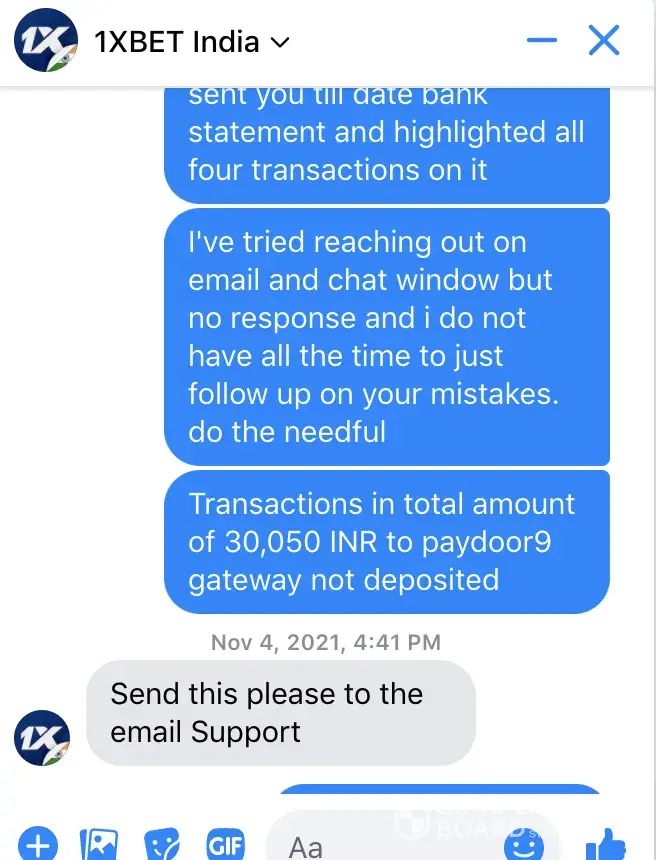 Really disappointed by 1xbet. I have been using 1xbet for a long time and had no issues. On 19th November i used bank transfer option to deposit money 90000PKR into my account and after transferring money i created deposit request but money wasnt credited into my account. I asked the guy on chat support and they said that they havent received the money. I filed a complaint with my bank and i was informed that the money was sent to the account the very same day. I sent all the transaction details, deposit slips, confirmation emails and my bank account statement at [protected]@1xbet-team.com but no one replys there. Now after providing all the documentations even the chat support has a default message saying to wait, they act like bots, not listening to what customer is saying and only saying that to wait. Its 26th November and still there is no response.
