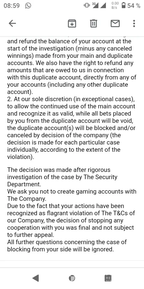 Due to the fact that your actions have been recognized as flagrant violation of The T&Cs of our Company, the decision of stopping any cooperation with you was final and not subject to further appeal.
