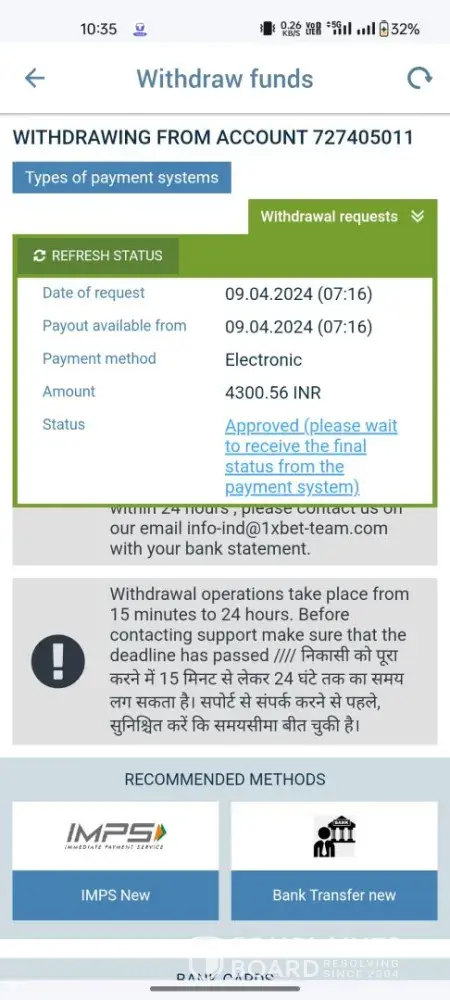 I withdrawn money from from 1xbet account Rs 31000/- on 13/04/2024 18:21