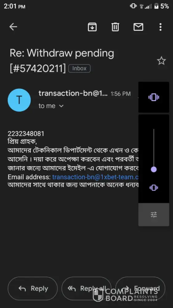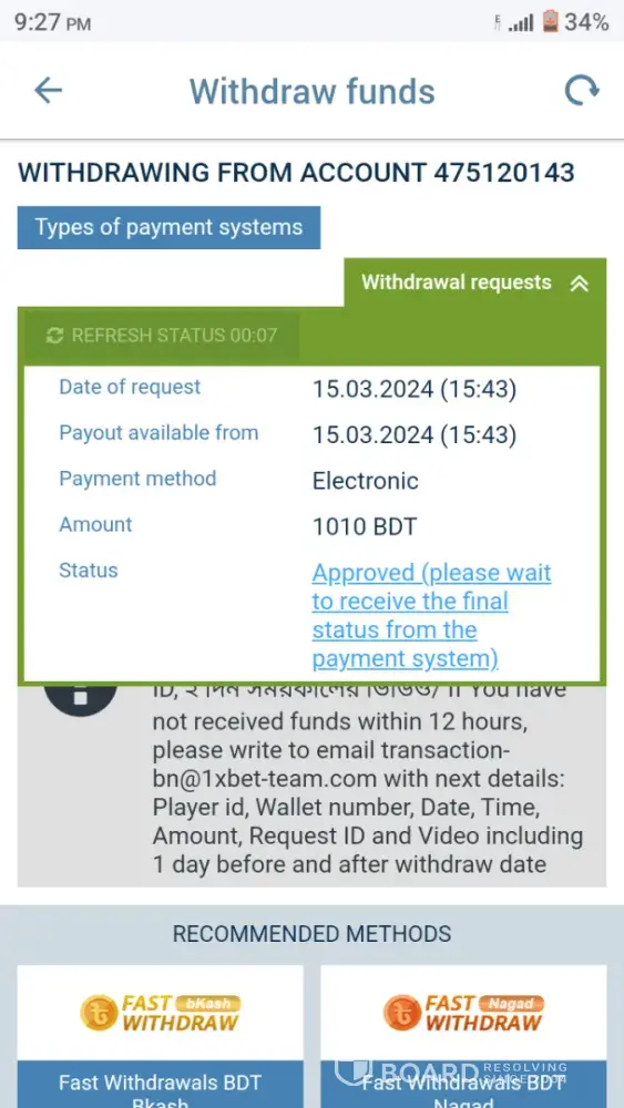 I was made a withdraw 5 days ago. I mailed Hundred times into ([protected]@1xbet-team.com) but with regret that they didn't solve my problem.They are not did their job correctly.That,s why i am sending you this mail.