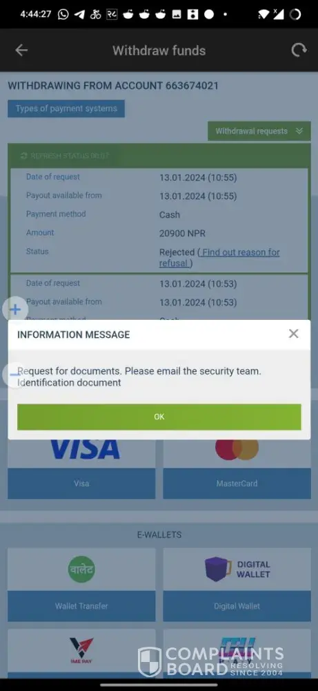 I wrote that I don't have a computer to go through it and that I'm in a place where I can't. I threw off all the documents, all the selfies that were requested, as everyone here has according to reviews. I don't want to bet with you anymore, or use your site. I'm just asking for a refund of my deposit! I've been going through verification for a year, every time something new! Just return my deposit and that's it!