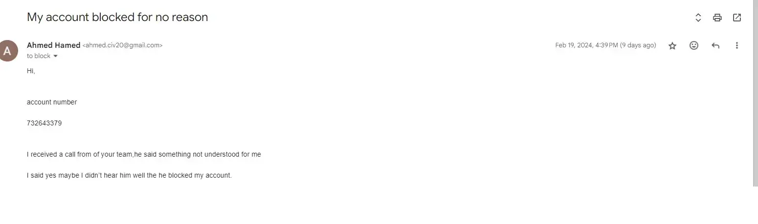I am writing to express my deep concern and frustration regarding the recent block on my account with the ID [protected]. I have been a loyal customer, and I am perplexed by the sudden and unexplained restriction on my account. Three weeks ago, I received a call from a member of your team. Unfortunately, the conversation was unclear, and the representative...