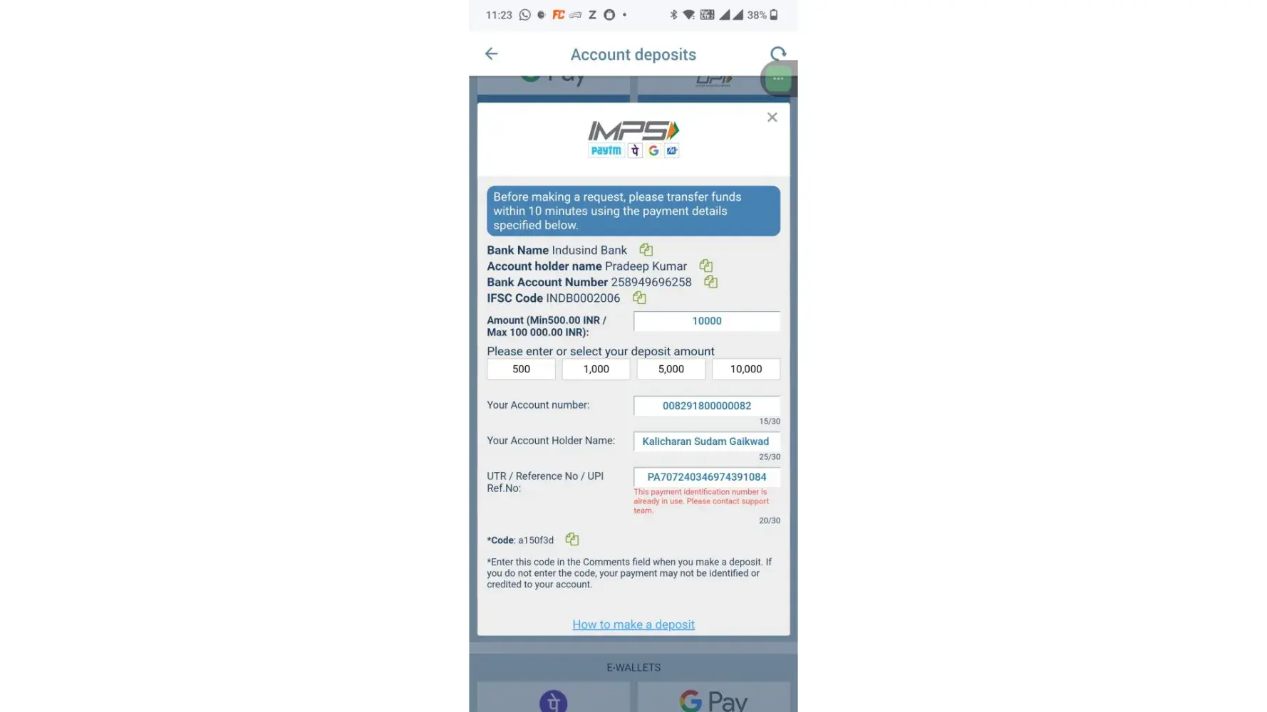 Getting an error while raising deposit request through IMPS Mode.