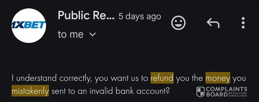 They should give me money either with company's funds cuz it's because of there technical error or second option is after asking their bank for a refund because the they sended a money in account which don't exists. Any bank will provide refund in this case. But they are not doing anything. Just making me mentally disturb. This is mental harrasment. I went through sleepless lights with overthinking, mailing since one month. Almost 10k INR is not a big amount for company like 1xbet but it is for me who's middle class person.