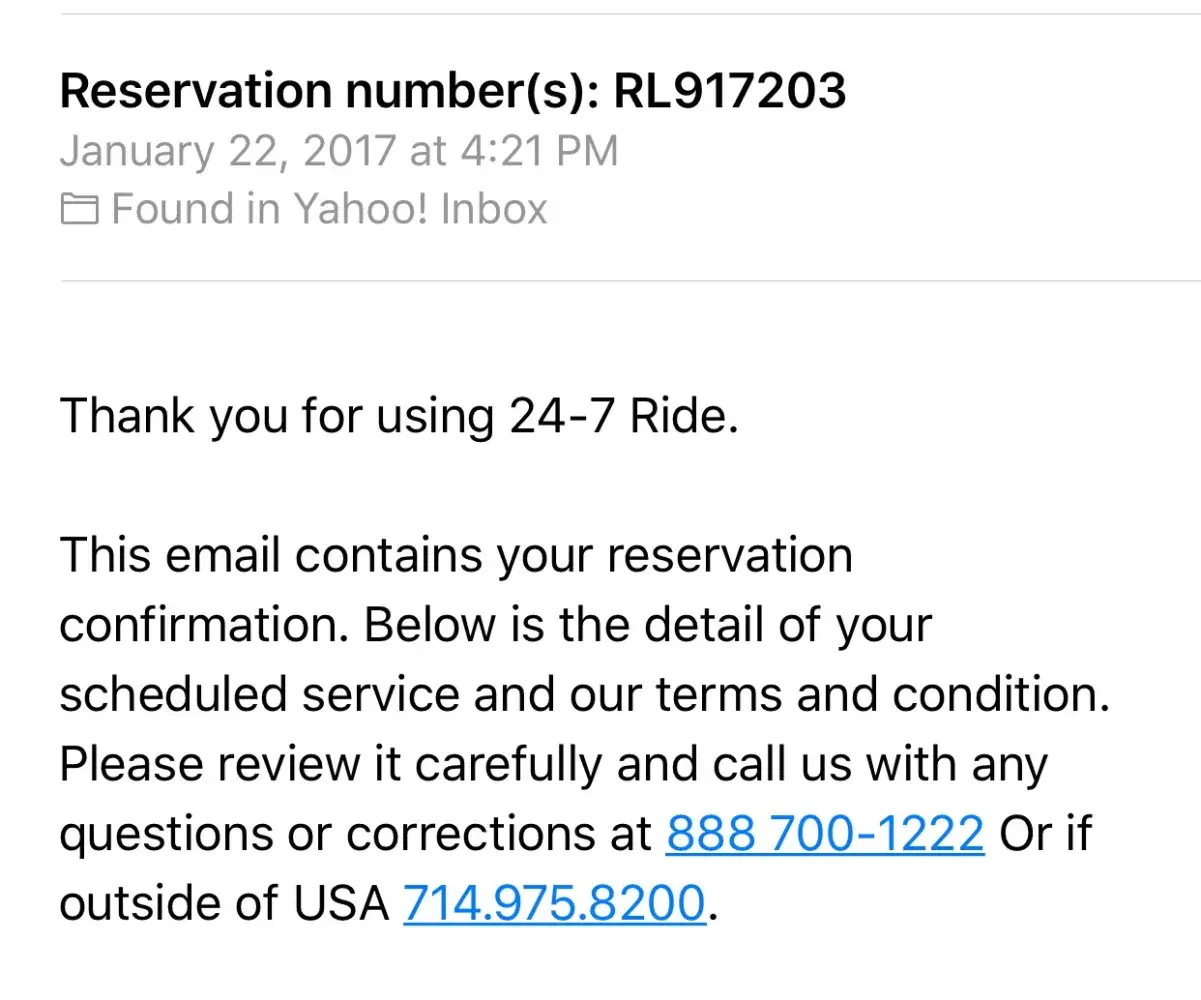 DO NOT USE 24-7 RIDE! They are horrible! They left us sitting waiting for our pickup to LAX at 5 am. No call, no show. I left them voicemails, called and texted the driver, no response. We had to find a last minute ride to the airport, pay someone else, and got to check in for our international flight 2 minutes before they cutoff check in.