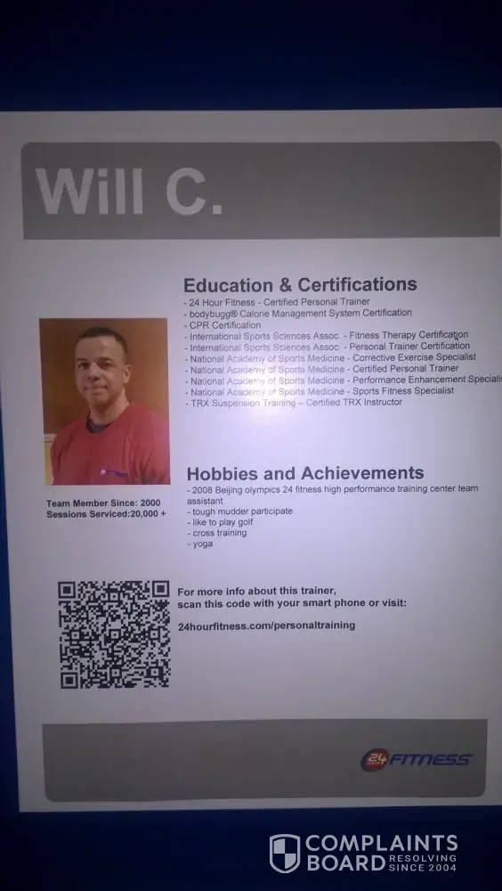A couple weeks ago - a 24-hour Fitness employee, Will Cambell, took my photo - Mr. Cambell said he was taking photos of a client and did not take my photo. If this is true, then he made every effort to simulate taking my photo…I was the only person in the immediate area - he pointed the camera/phone directly at me - and paused, then walked away. If your gym has CCTV of the main gym floor- please review it and make your own determination.