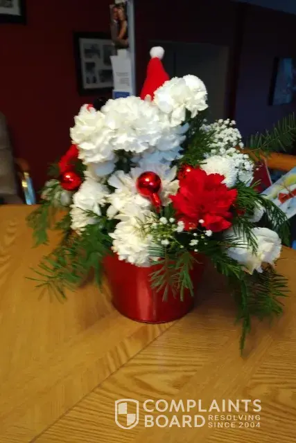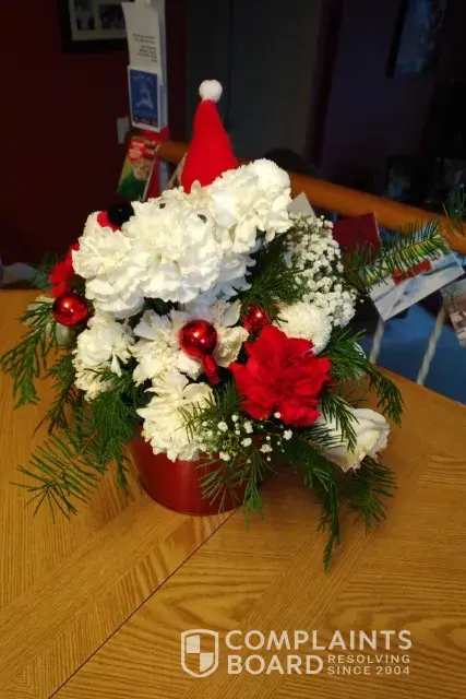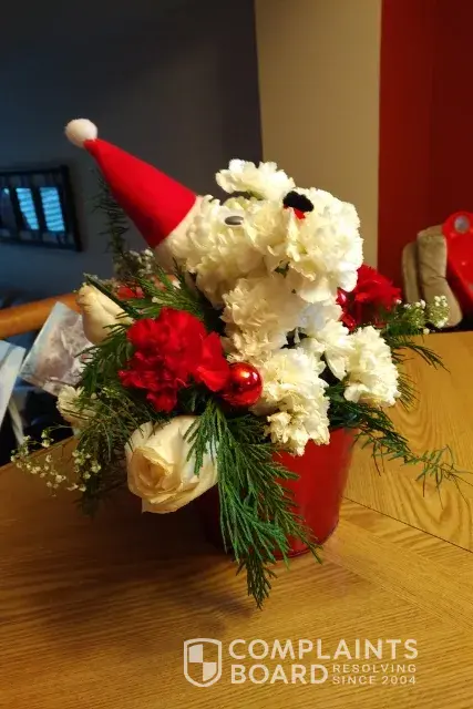 I ordered an arrangement "Santa Paws". I called and placed the order over the phone. I specifically asked if it would be exactly as the display online. I was told yes. Once received I had my sister send me pictures. It looks nothing like the arrangement online and the container was not the one shown in the picture either. I am extremely disappointed with this arrangement given the price I paid. Definitely not worth the money and I would never use them again. I feel I should be refunded at least partially.