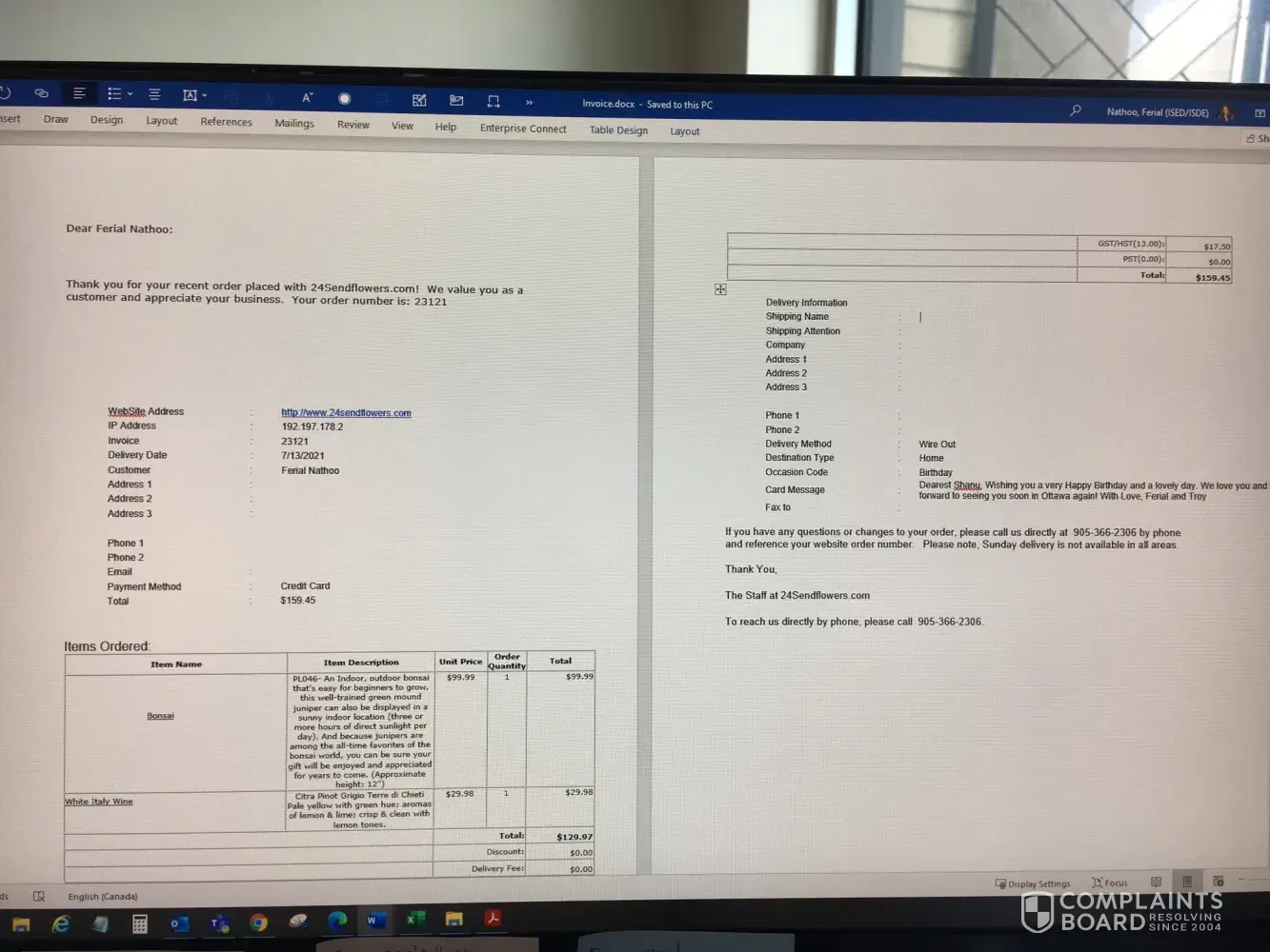 Lastly, my invoice emailed to me, with correct items to be delivered and proof of card message that never got to my aunt.