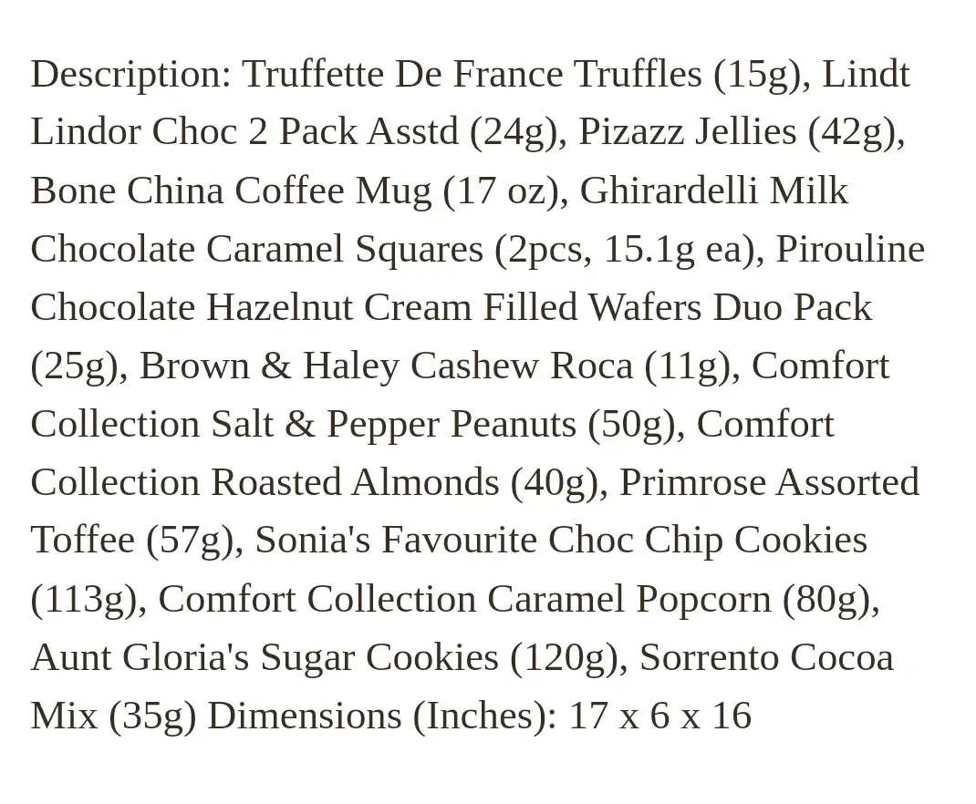 The order received was nothing like what was advertised on your website. I am attaching screenshots of what you said would be in the gift basket vs what got delivered. This is unacceptable and please fix this as soon as possible!