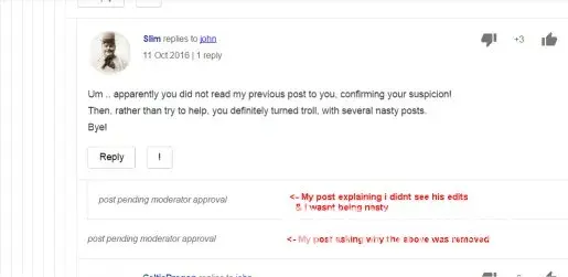 Slim is the main troublemaker, baiting people into posting by grilling them with questions to make them prove their reasoning of their post, then discredit anything they say, so his buddies have a reason to troll the thread. They challenge anyone who asks a question and gangs up on them. When they are shown they were wrong about something, they simply remove your post into a PPMA ("Pending Post Moderation Approval"), which is never approved.