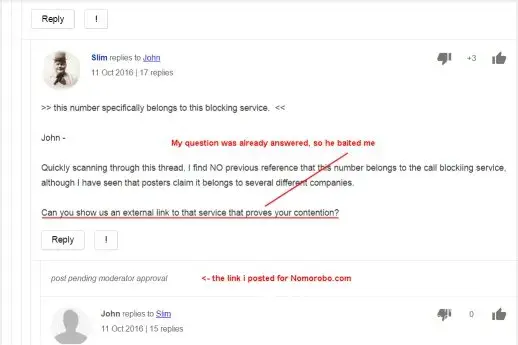 I made a post about a number that i had information of, more than just that they called, but my post went right into moderation. I attempted several times to post it, but then asked what happened and could a moderator explain. A registered user answered my questions just fine and i was ready to move on. A second registered user then started asking questions, even though he could see i had been helped, i even said that i had been helped. He continued asking questions towards the validity of what i had posted, or wanted to post but couldnt due to the site blocks the name Nomorobo. My post was specifically about that blocking service since it was their number i was posting about. He baited me by asking me to post an external link to prove the number was specific to that service as i claimed. I tried, but it went automatically in moderation and he knew it would. He then badgered me saying if i cant prove it i must be a troll and then edited his post once he realized i was right and i replied before i seen it. He then removed my posts saying that i was being nasty and not helpful.