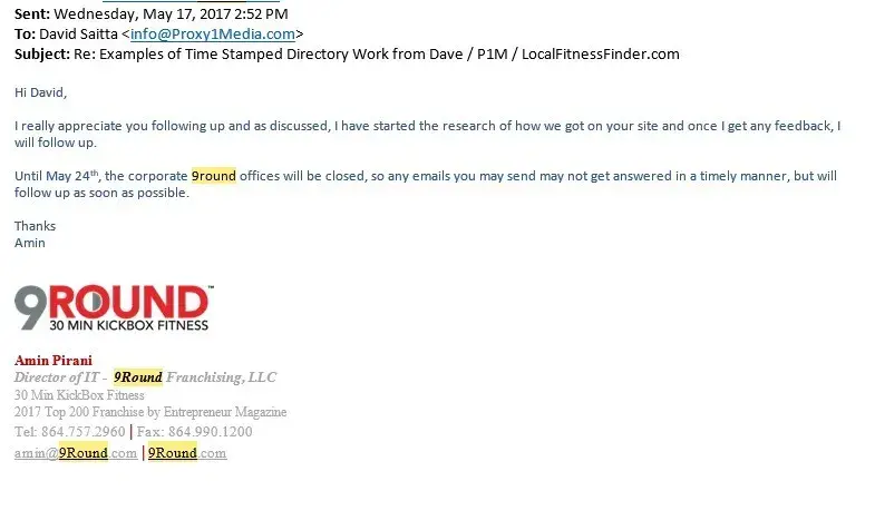 Corporate office hired an off-shore marketing agency then had no control over them while them spammed our fitness directory over 500 times creating fake profiles to only get their phone number listed.