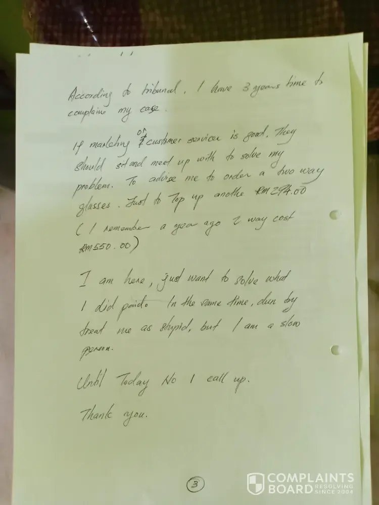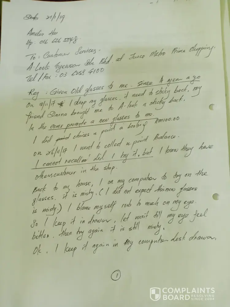 25/2 - I had went to Alook at Dpulze branch to buy a new spectacles. Upo checking the eye, the staff told that my 'silau' and power had increased highly. Before is 1.75 and new one is 2.75. And i have pay more coz of the power increase which is rm258 instead of rm168 for the frame n normal lense.total all is rm500+. Upon collection, staff mentioned it will take 3 days with headache. However after 1 week using it, i still have bad headache even when in office but when using old spectacle no problem. I decided to go back to the shop and ask them to follow old power which should be lesser price. When i ask bout refund, they say that they cant refund because change lenses and high power will take more times. How can i do work like this? And nobody tell me on this. This is not first time i wear new spectacles. This is so unfair because it is not my mistake and the staff seem not responsible at all! I urge to you to refund back the balance or if not please refund 100% my money back. Failing which I will bring this matter to the authority.