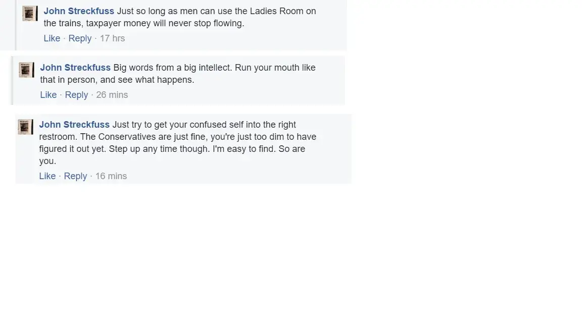 Jay, one of the owners of this business, threatening people on Facebook and expressing extreme bigotry towards trans people.