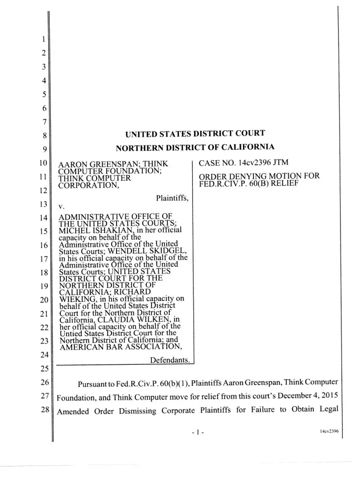 Aaron Greenspan, Think Computer Foundation v. Administrative Office of the US Courts, Case No. 5:2014-CV-2396 JTM