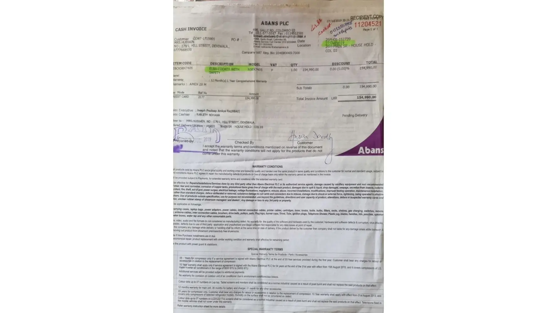 I have purchased a 55 inch Televsion form the Nuwara Eliya Abans show room. It worked fine for few months and it got several lines in the display. To get fixed those lines I have return it to the Abans Nuwara Eliya brunch as ths warranty period is not exceeded. Though the brunch has inform me that I can claim a new Television for the old. I hereby inform that even though 11 months have passed since I given the TV, I have not received a new TV. I kindly request you to look into this and give a good answer.