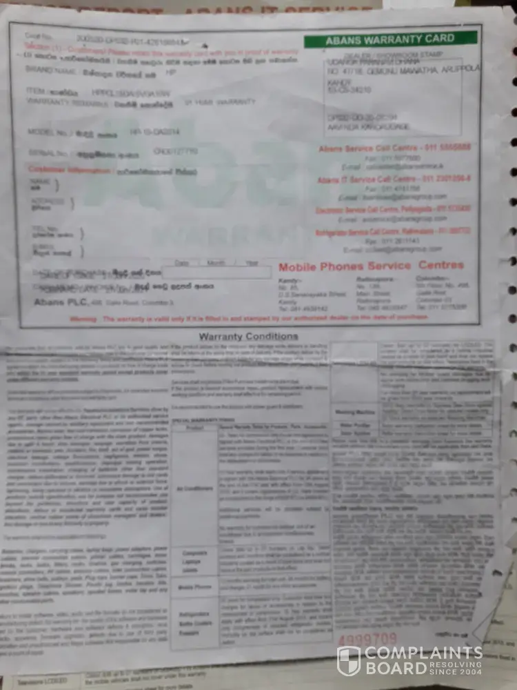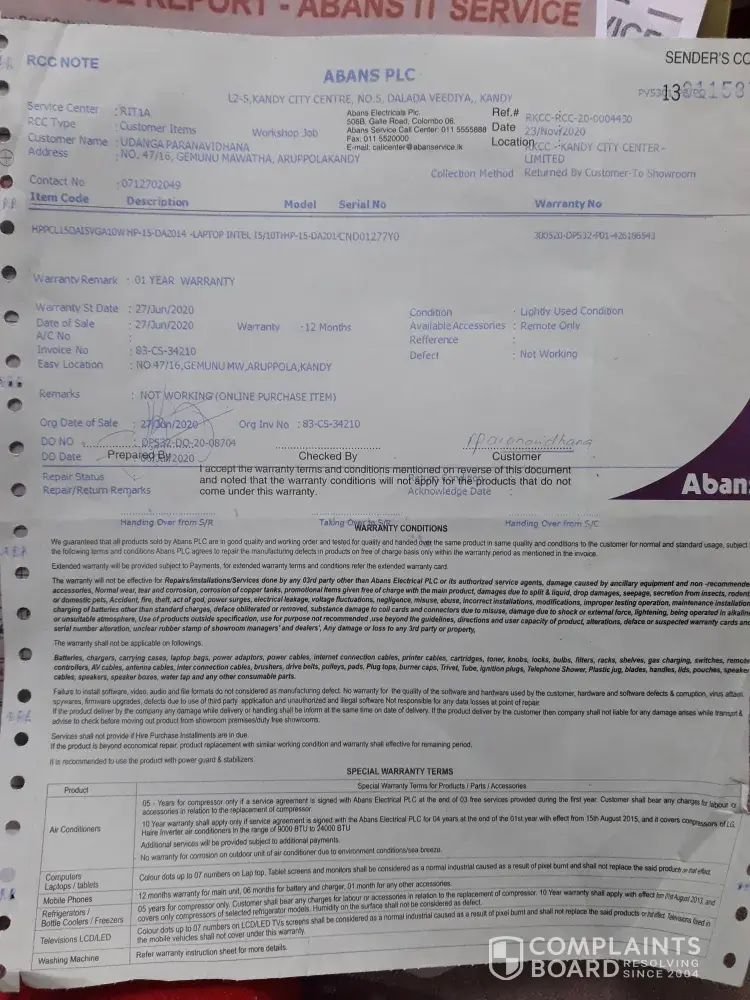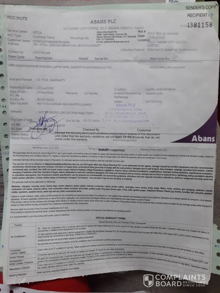 We, Udanga Paranavidhana and Rangi Paranavidhana purchased a laptop that cost us Rs.122, 990/- for our children for their school work, on the 27th of June 2020 through Abans online. It was delivered on the 06th of July. By the 12th of November 2020, it stopped working and was taken to the branch at Kandy City Centre. From there, they said there is nothing they can do about it and we were told to hand it over to the repair centre, which we did on the same day. We had to call daily and ask them what's wrong with it but the only answer we got was that they were 'still checking'. FInally they said it was a problem with the motherboard. Then we called the hotline, they asked us to collect it from the repair centre and hand it over to the KCC branch, that was on the 23rd of November 2020. Since we were facing so much difficulty with no way of doing online work of school we went to the repair centre, collected it from there and took it KCC branch. At KCC branch I was asked for the box that they delivered the laptop in since it was useless after it was delivered, I said I have thrown it away. Then I was told till I bring a cardboard box they will not be able to send it to Colombo for repairs. Please do feel free to confirm this from the Manager Thusitha of KCC Abans branch. I went to town and brought cardboard, bubble wrap and sellotape, please do confirm this as well as I'm sure you have CCTV in the showroom. We complained about it to the hotline (Asiri Dayarathne handled the call) and the KCC branch manager apologized. Even after the repairs, it wasn't delivered to us, we were asked to come to the KCC branch to collect it on the 9th of December. By then, our kids didn't have the laptop for nearly a month. I asked them for a detailed description of the repairs they had done as I have a right to know what they had done to actually repair it. We have lost faith as to whether they had repaired it at all. But I wasn't given any information. Two days after it was brought home, we realized that there is a connection problem. Unless the laptop is within a 2m radius, it doesn't connect to the wifi. This problem arose when we got it back from repairs. As we thought it might be a problem with the wifi router, we checked it. We found nothing wrong with it as the other devices worked perfectly. We're tired of the whole repairing process and we cannot rely on it. Sending it for repairs again within 5 months of purchase is absurd and very unfair on us as we have already settled the payments. We do not want a replacement by your company as your company has proved to be unreliable. Therefore kindly collect your item and refund our payment as you have caused us more than enough trouble during this difficult period of time.