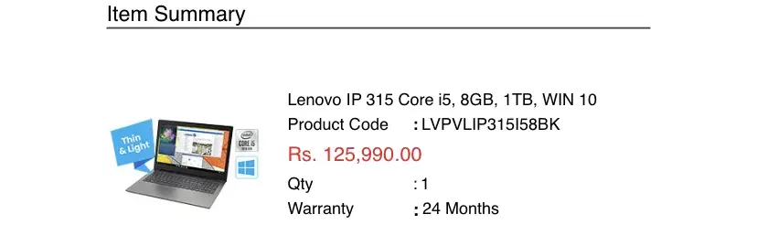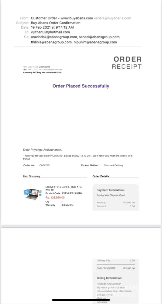 I have placed a order through buyabans for a Lenovo laptop ( product code LVPVLIP315I58BK ) on 19th February 2021 (order number C0047061).