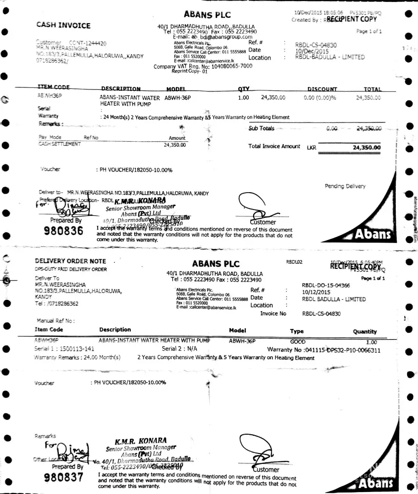 Dear Sir, Yesterday I have purchased your Abans Instant Water Heater with water pump(ABWH-36) from Badulla Showroom. Recent to buy this particular model with water pump my place having low water pressure in the water line. Today we have fix this unit but unfortunately pump not start with shower valve. To start pump every time we have to press pump on button which is not convenient all also not good to unit. Then I check with your manual and customer service and then only it mentioned, this particular unit need good water pressure to start pump automatically. Since I dont have sufficient water pressure in my water line and to rectify this and get hot water, I purchase this heater. Sadly this also need good pressure to work which not mentioned before I buy this. With this situation I am unable to use this unit and I have to return this. So pls help me to solve this issue and give me good solution herewith I have attache invoice and warranty for your attention, Thanks & Regards, Nadeera