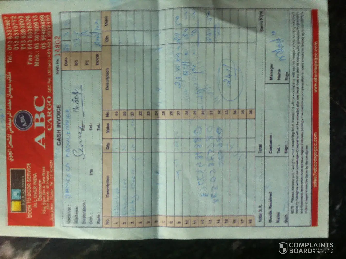 My self shakilur rahman despatched 13 boxes cargo through abc cargo al jubail k.s.a to new delhi in the month of june 2015 in 3 trips. already 16 months have passed but still i did not received a single box. details as follows.