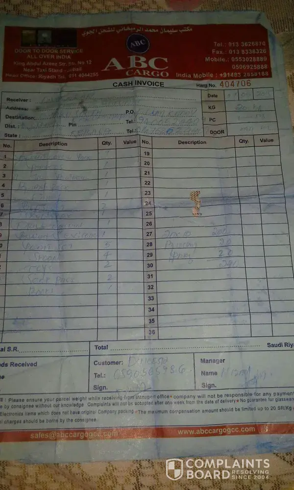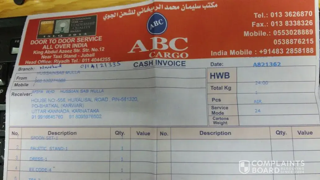 On 6-June-2015, I sent parcels of my 11 boxes of household items, electronics, books and clothes, from ABC cargo services in Al Hassa/Hofuf, Saudi Arabia. Later after a week on [protected], I submitted another cargo from the same service of 5 boxes of household items, ABC cargo promised me the parcels will be received to me in India, Hyderabad within 60 - 90 days, surprisingly I received my second parcel of 5 boxes which I submitted on 15- June - 2015, on 14- September - 2015, exactly 3 months of my cargo handover to ABC. But my first cargo submitted to ABC on 06-06-2015, of 11 boxes is never been transported to me. Since then I have been wondering were my first cargo of 11 boxes is gone, I have never received it till date. ABC have duped me of my money to transport my items and also cheated me by not providing me the information on my cargo, I have called there HASA branch in KSA and all the branches in KSA, my brother visited their branches in KSA and their India number never works and no update on website. ABC has robbed my cargo and cheated me and have caused lot of damage to me financially. I want ABC Cargo to refund/return/repair my loss and damage.