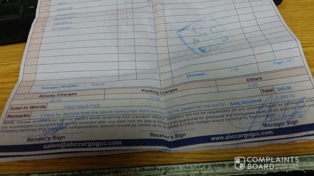 My cargo 25 kg. Riyadh to katak (Orissa) india contact information: abc cargo shara rail batha riyadh (Saudi arab) ksa abccargogcc.com respected sir, booking a255687 date 21-07-2015 in the name of receiver mr. Mohd jeelani sender name mr. Abdul basar & I paid 972 saudi riyal to abc cargo.