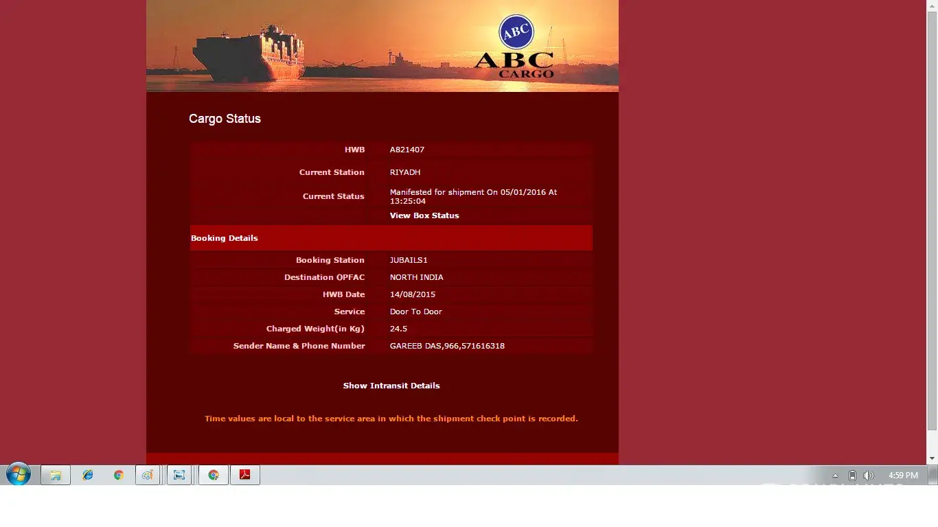 Respected sir, booking 163312 date 07.07.2015 in the name of receiver famida asif lashkar, sender name asif lashkar & I paid 255 sr riyal to abc cargo.